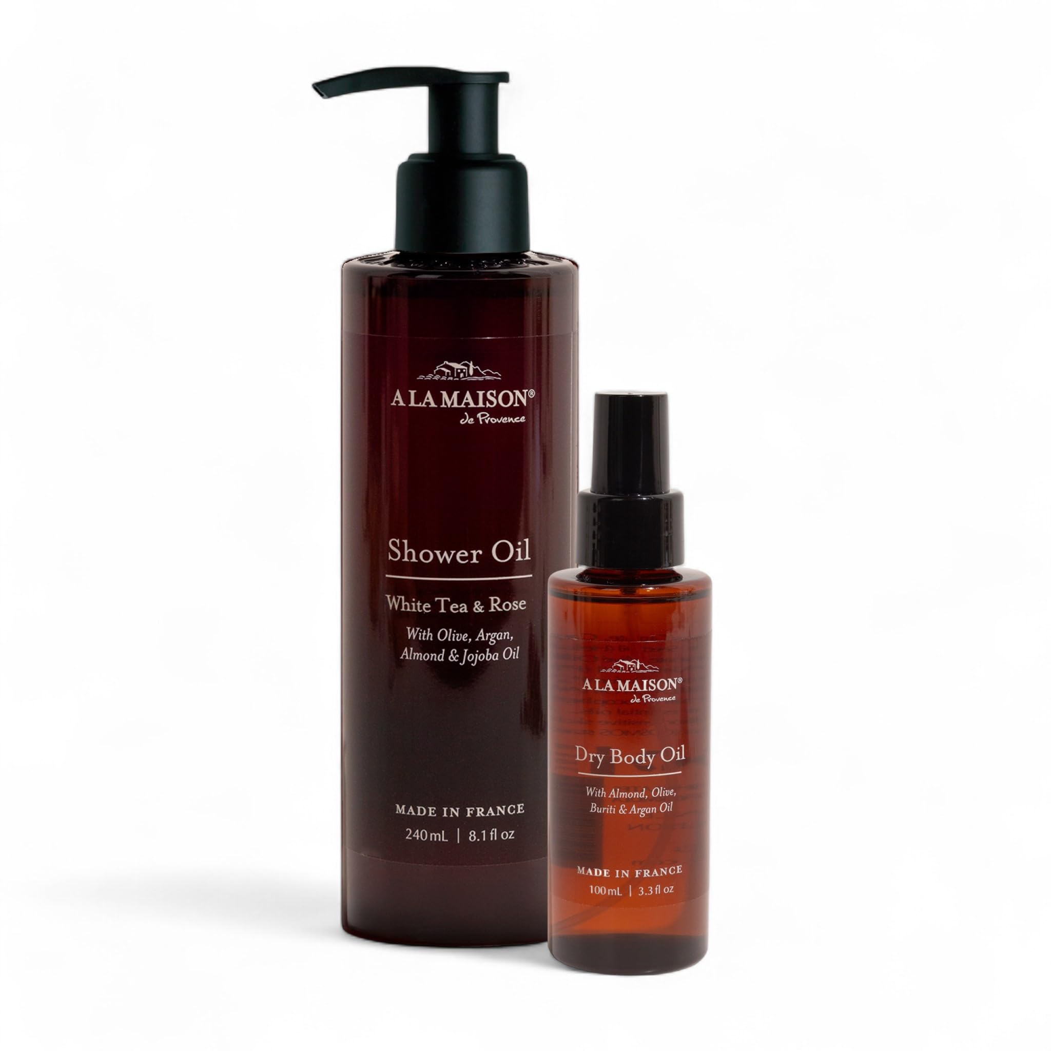 A LA MAISON Amber Collection White Tea & Rose Duo: Shower Oil - 3.3 oz Moisturizing & Fast-Absorbing Body Oil 8.1 oz Hydrating Body Wash Alternative