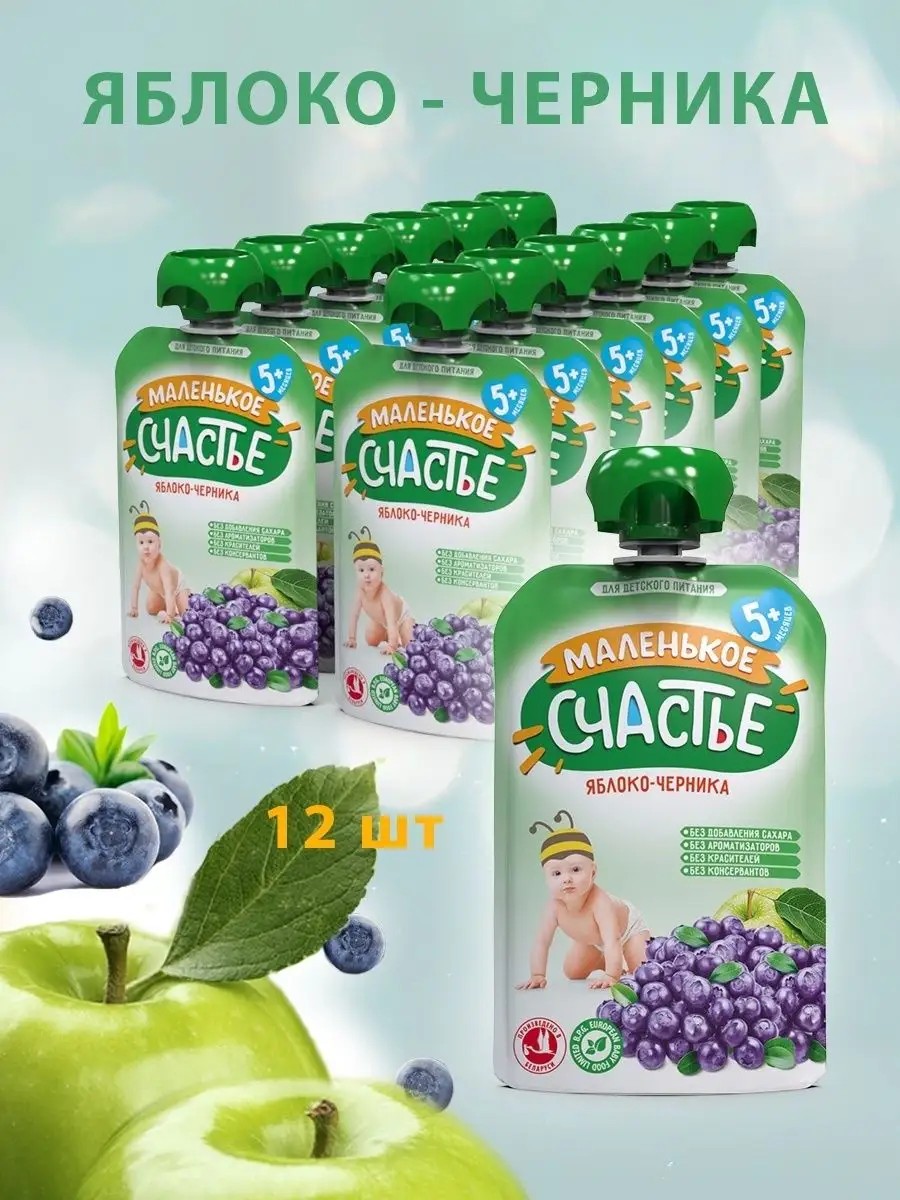 МАЛЕНЬКОЕ СЧАСТЬЕ Детское пюре Яблоко Черника 5 мес+,12 шт по 90г. Для изготовления фруктового пюре "Маленькое счастье" используется только сырье селекционных сортов, выращенных в природоохранной зоне и рекомендованных белорусской Академией наук и Институтом овощеводства. Вся продукция производится с соблюдением жестких требований по показателям безопасности. Наши пюре богаты витаминами и минеральными веществами, а клетчатка улучшает пищеварение малышей.