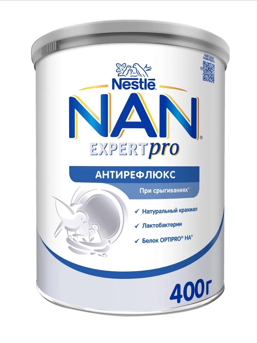 NAN Антирефлюкс смесь от срыгиваний 400г с 0 мес для специальных потребностей. Смесь НАН Антирефлюкс для специальных медицинских целей, предназначенная для устранения срыгиваний. Подходит в качестве единственного источника питания для детей с рождения. Смесь обеспечит вашего ребенка всеми питательными веществами, необходимыми для его оптимального роста и развития. Смесь NAN Антирефлюкс способствует уменьшению срыгиваний за счет натурального крахмала и живых пробиотических культур - лактобактерий L.reuteri в составе продукта. Смесь NAN Антирефлюкс также содержит полученный по специальной технологии частично гидролизованный гипоаллергенный белковый комплекс OPTIPRO HA, который легко усваивается. Сниженная аллергенность белка OPTIPRO HA позволяет уменьшить риск развития аллергических реакций.Идеальной пищей для грудного ребенка является молоко матери. Перед тем как принять решение об искусственном вскармливании с использованием детской смеси, обратитесь за советом к медицинскому работнику.