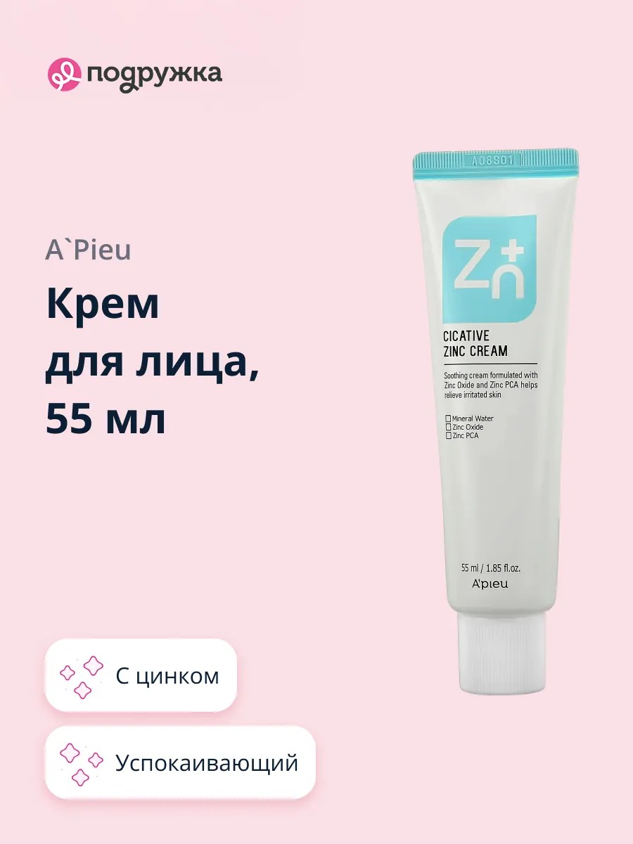 Корейский успокаивающий крем для лица A`PIEU CICATIVE с цинком эффективно ухаживает за чувствительной кожей лица благодаря входящему в его состав цинку, который прекрасно регулирует работу сальных желез, очищает поры и придает здоровый вид коже, активно способствует разглаживанию мимических морщин, восстанавливает эластичность и упругость кожи. Аллантоин, увеличивая содержание воды в клетках кожи, обладает мощным увлажняющим эффектом, отлично защищает от вредных воздействий окружающей среды, способствует клеточной регенерации и ускоренному заживлению. Минеральная вода питает кожу, насыщает ее необходимыми микроэлементами, укрепляет и тонизирует.