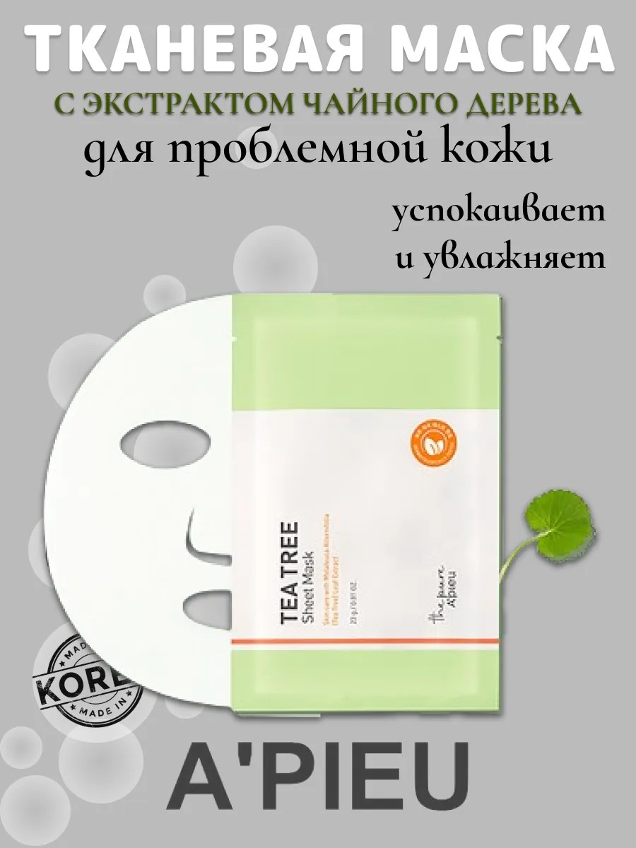 Тканевая маска для проблемной кожи A'PIEU The Pure Tea Tree Sheet Mask восстанавливает, увлажняет и успокаивает, устраняет покраснения и раздражение, уменьшает воспаления и предотвращает появление новых. Маска смягчает кожу, заживляет, выравнивает тон, снижает чувствительность и реактивность кожи.