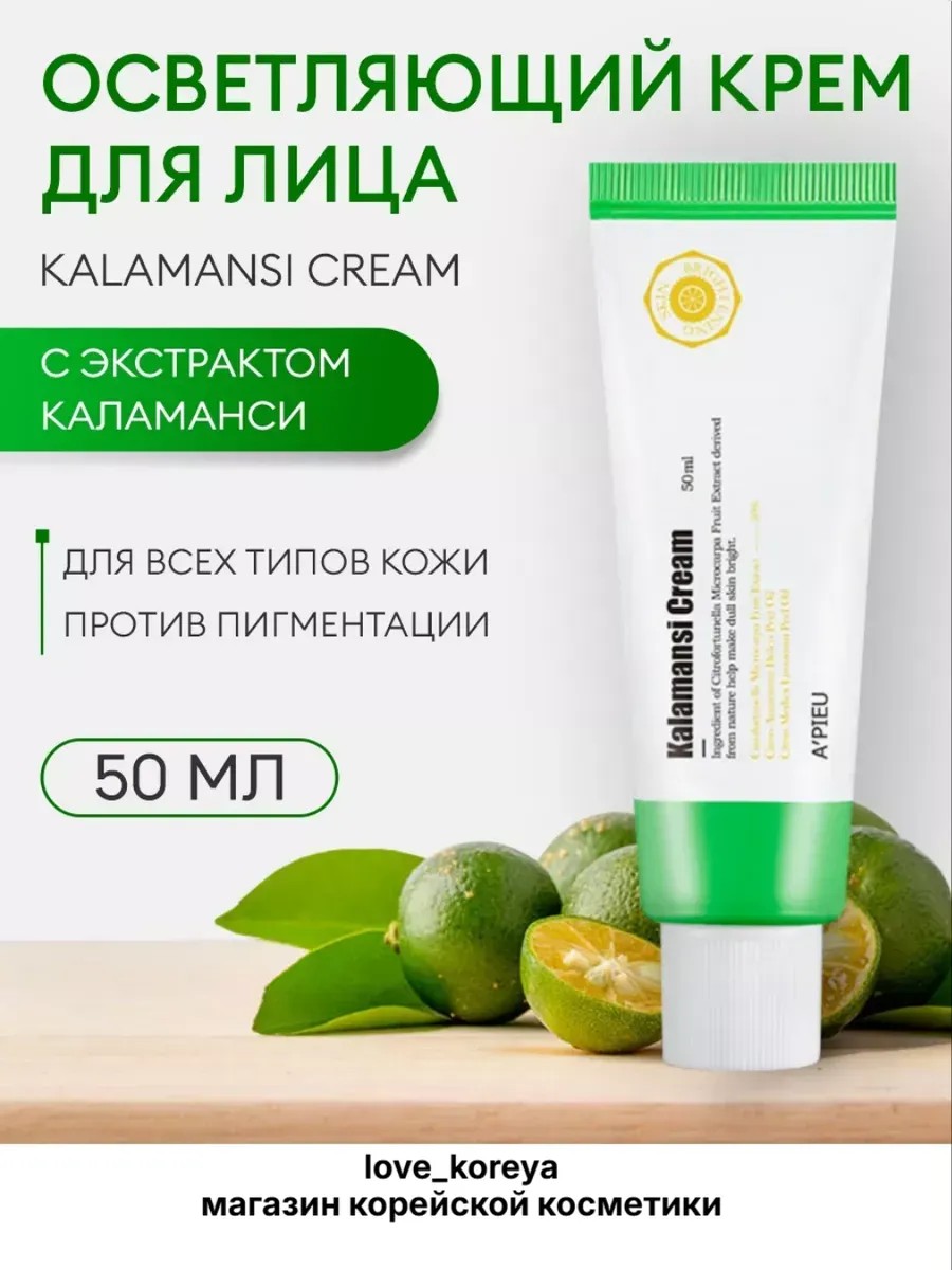 A'PIEU Kalamansi Cream, a brightening face cream with calamansi extract, has a multifunctional effect: it moisturizes and soothes, reduces redness, reduces sensitivity and allergies, relieves stress and fatigue, gives the face a fresh and natural glow, and also works as a pore-tightening agent. The cream's key ingredient is calamansi extract (also known as calamondin, citrofortunella, or musk lime). This citrus hybrid (a citrus fruit obtained by crossing a mandarin with a fortunella) native to Southeast Asia contains 30 times more vitamin C than lemon, giving tired and dull skin a boost of energy, an even and clear tone, and helping to lighten pigmentation of various origins. This Korean moisturizing face cream relieves stress and tension, restores damaged cells, infuses tissues with freshness and energy, and gives skin a well-groomed and rested appearance. This cream for skin with rosacea helps strengthen blood vessel walls thanks to its high vitamin C content. This Korean face cream gently lightens pigmentation, smoothes fine lines, nourishes the skin with beneficial antioxidants, prevents wrinkles, and maintains elasticity and smoothness. The hypoallergenic formula does not cause irritation. **Directions for use**: Squeeze a small amount of cream, apply to face, and massage gently. Suitable for daily use.