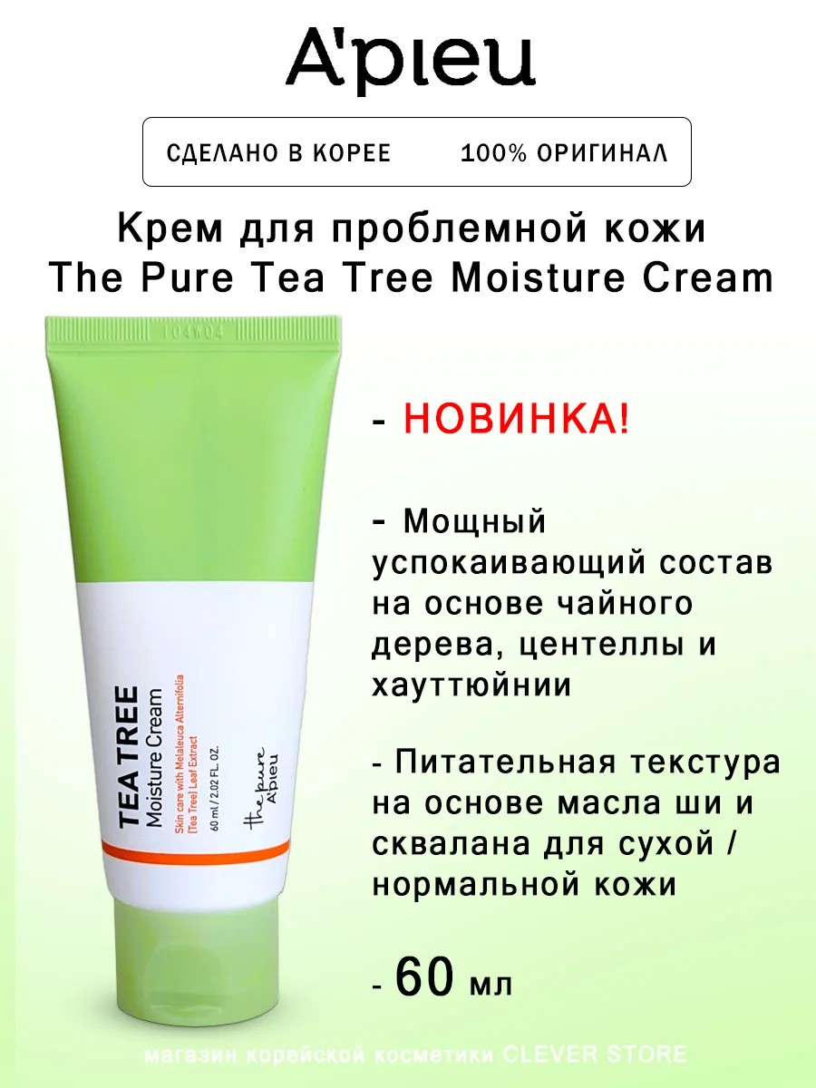 A'PIEU The Pure Tea Tree Moisture Cream for problem skin provides intense anti-inflammatory and soothing action, eliminates redness and irritation, normalizes sebaceous gland function, reduces oiliness, reduces inflammation, and prevents new ones.