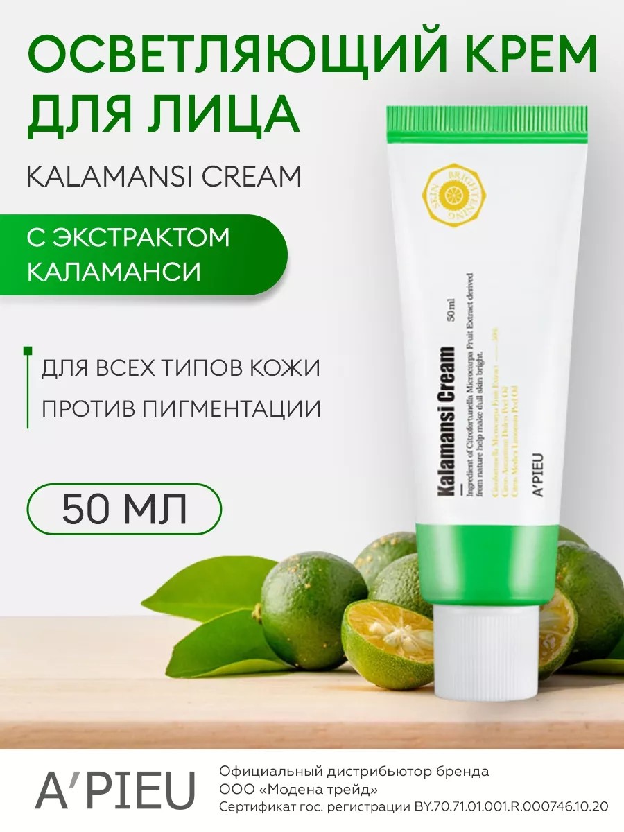A'PIEU Kalamansi Cream, a brightening face cream with calamansi extract, has a multifunctional effect: it moisturizes and soothes, reduces redness, reduces sensitivity and allergies, relieves stress and fatigue, gives the face a fresh and natural glow, and also works as a pore-tightening agent. The cream's key ingredient is calamansi extract (also known as calamondin, citrofortunella, or musk lime). This citrus hybrid (a citrus fruit obtained by crossing a mandarin with a fortunella) native to Southeast Asia contains 30 times more vitamin C than lemon, giving tired and dull skin a boost of energy, an even and clear tone, and helping to lighten pigmentation of various origins. This Korean moisturizing face cream relieves stress and tension, restores damaged cells, infuses tissues with freshness and energy, and gives skin a well-groomed and rested appearance. This cream for skin with rosacea helps strengthen blood vessel walls thanks to its high vitamin C content. This Korean face cream gently lightens pigmentation, smoothes fine lines, nourishes the skin with beneficial antioxidants, prevents wrinkles, and maintains elasticity and smoothness. The hypoallergenic formula does not cause irritation. **Directions for use**: Squeeze a small amount of cream, apply to face, and massage gently. Suitable for daily use.