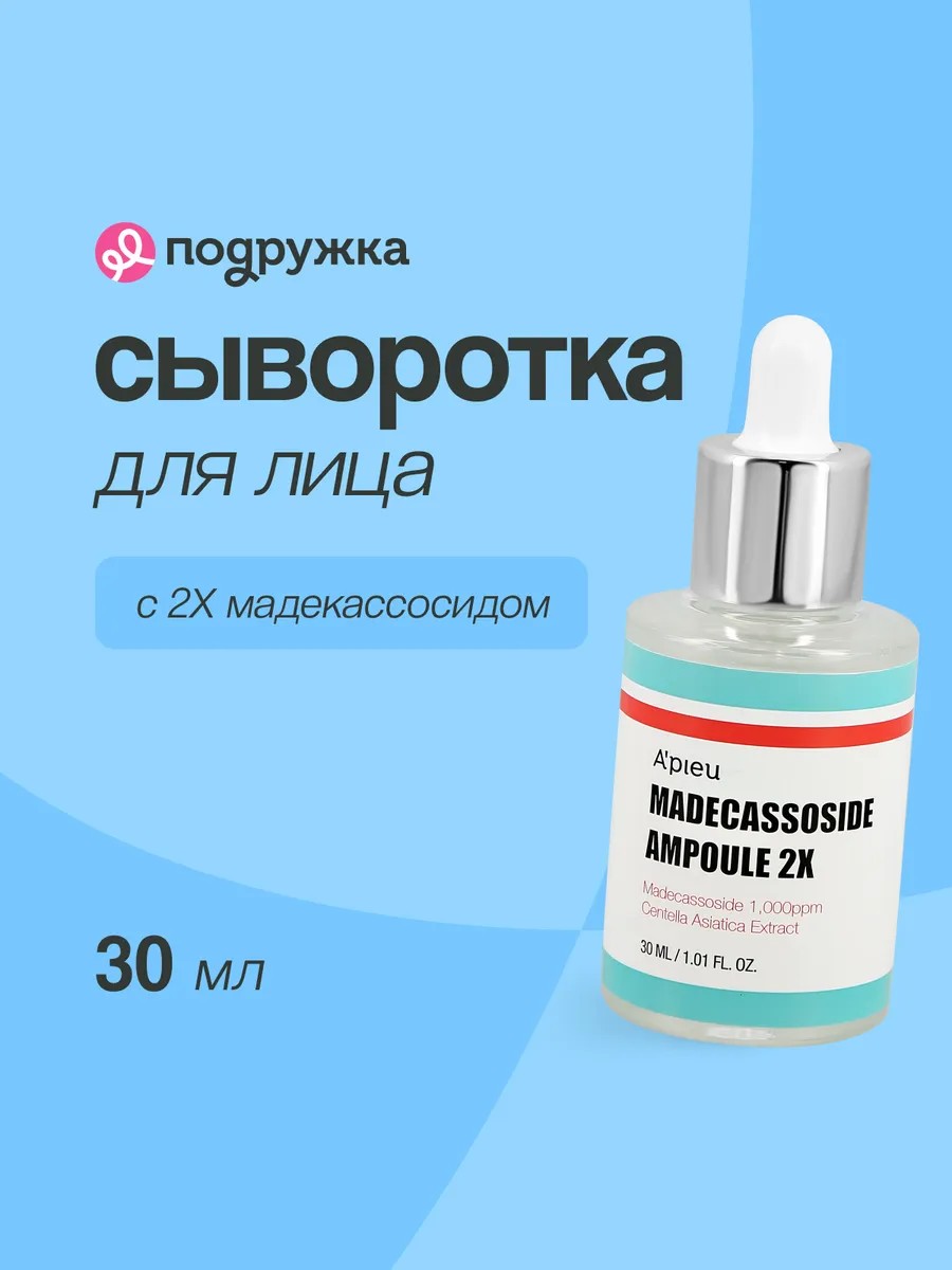 Корейская сыворотка для лица A`PIEU MADECASSOSIDE с 2X мадекассосидом интенсивно увлажняет и успокаивает кожу. Основные компоненты сыворотки: экстракт центеллы азиатской и мадекассосид. Экстракт центеллы азиатской является источником витаминов А, В, Е, К и магния. Магний оказывает антиоксидантное действие. Мадекассосид помогает восстановить синтез коллагеновых и эластиновых волокон. При ежедневном использовании внешний вид кожи заметно улучшается: тон лица становится более ровным, сужаются поры, несовершенства проходят заметно быстрее, пропадает чувство сухости и стянутости.