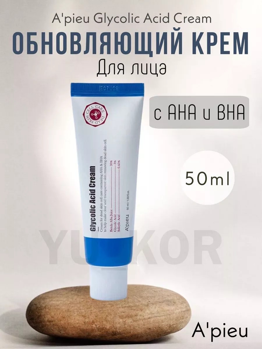 Обновляющий крем для лица с AHA и BHA A’PIEU Glycolic Acid Cream благодаря комплексу AHA и BHA кислот мягко отшелушивает ороговевший слой кожи, осветляет пигментные пятна и оздоравливает цвет лица.