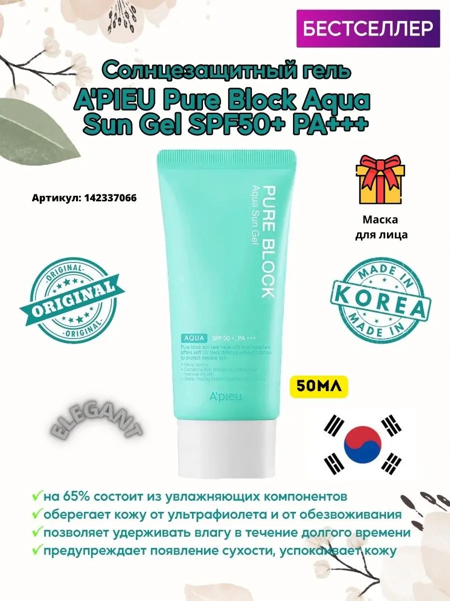 Солнцезащитный крем для лица A'PIEU Pure Block Daily Sun Cream SPF45 PA+++ Подходит для ежедневного использования, обладает мягкой, гипоаллергенной формулой. Обеспечивает защиту от UVA лучей, свободных радикалов и предохраняет кожу от обезвоживания, вызванного пребыванием на солнце. Создает мягкое, комфортное покрытие, имеет текстуру лосьона, не оставляет липкого эффекта. 2. 2\. Солнцезащитный гель для лица APIEU Pure Block Aqua Sun Gel SPF50\+/PA\+\+\+Увлажняющий солнцезащитный гель\-крем с легкой текстурой\, замедляет процессы старения\, повышает эластичность\, обладает противовоспалительным действием\, улучшает кровообращение и цвет лица\. Обладает облегченной текстурой\, благодаря которой легко распределяется и отлично подходит для жирной и комбинированной кожи\. 3. 3.Солнцезащитный водостойкий крем для лица A'PIEU Pure Block Water Proof Sun Cream SPF50+/PA+++Крем устойчив к воздействию влаги, что делает его идеальным вариантом для использования в летний период. Для склонной к жирности кожи.\ 4. 4\. Солнцезащитная база под макияж Pure Block Tone-Up Sun Base SPF50/PA+++ от южнокорейского бренда Апью обеспечивает устойчивость декоративных косметических средств, выравнивая тон и поверхность кожи, и выполняет свою основную функцию, защищая кожный покров от фотостарения, вызываемого воздействием UVA и UVB. Благодаря заложенной в формуле сан блока степени защиты SPF50/PA+++, 90% лучей, вызывающих повреждения эпидермиса не могут пройти через невидимый, но действующий барьер.