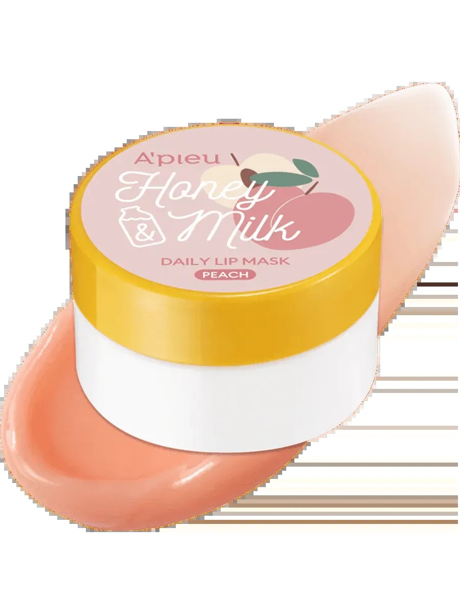 A'PIEU Honey & Milk Daily Lip Mask (Peach), a peach-scented nighttime nourishing mask made with honey extract and milk proteins, has a delicate texture without leaving a sticky film on the lips.