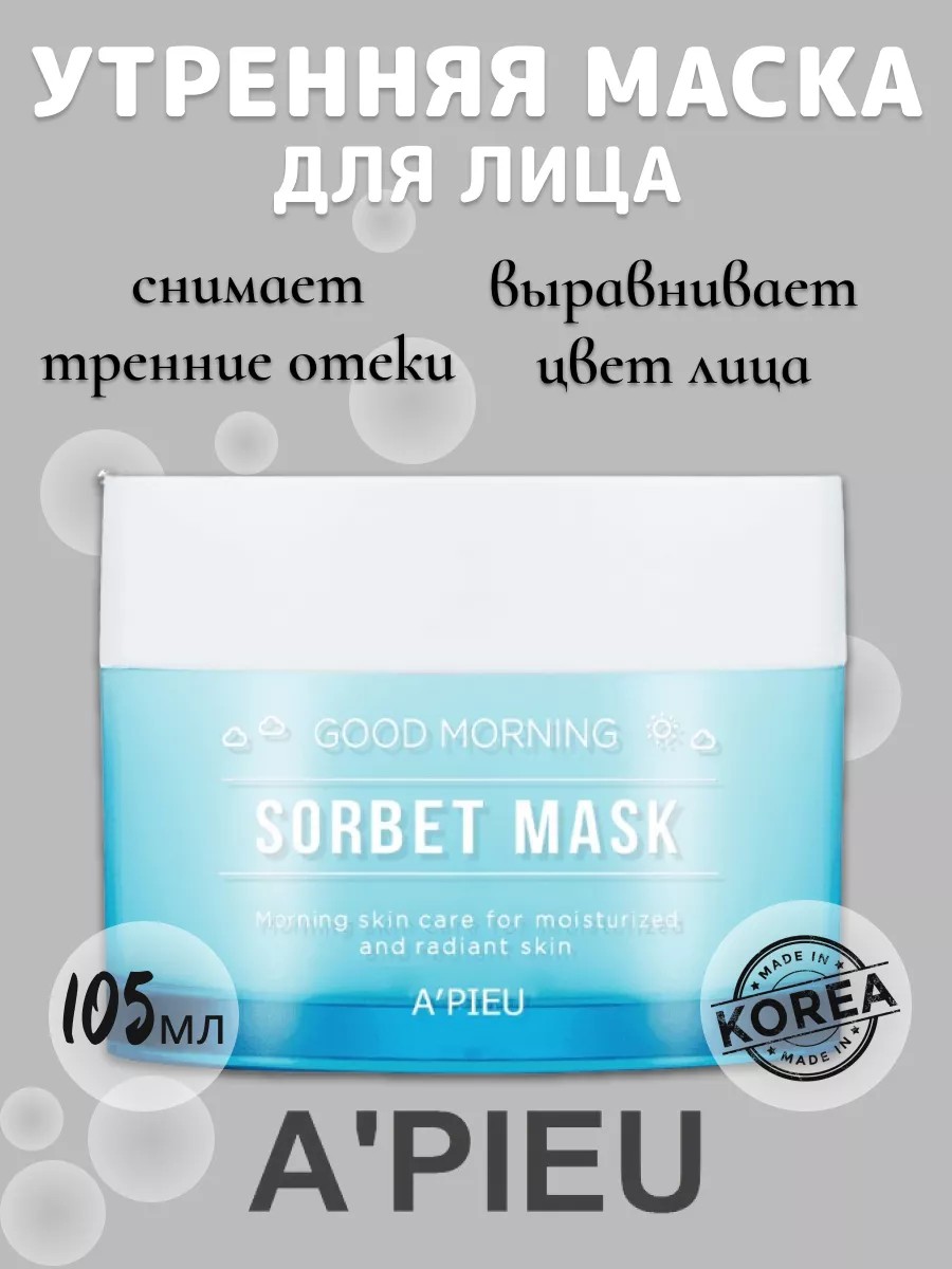 Утренняя увлажняющая маска-сорбет для лица делает кожу мягкой и бархатистой, способствует снятию утренних отеков, выравнивает цвет лица, снимая покраснения и раздражения, предупреждает развитие воспалений. Утренняя маска для лица A'PIEU Good Morning Sorbet Mask - утренний маст-хэв для вашего лица! Он сделает кожу вашего лица гладкой и увлажненной, придавая ей свежий и отдохнувший вид. Обладает хорошей гигроскопичностью, хорошо впитывает влагу и удерживает ее, что благоприятно сказывается на внутреннем и внешнем состоянии кожи, а также предупреждает появление кожных заломов, вызванных сухостью. Экстракт тыквы в составе оказывает бактерицидное, ранозаживляющее и противовоспалительное действие, используется для лечения акне. Насыщает витаминами, тонизирует кожу, освежает и улучшает цвет лица. Обладает легким осветляющим эффектом. Является антиоксидантом и защищает кожу от негативного воздействия ультрафиолета. Ледниковая вода Аляски помогает придать коже гладкость, бархатистость и ровный цвет, уменьшить отеки, повысить тонус кожи, насытить кожу комплексом важнейших микроэлементов. Экстракт лемонграсса эффективно влияет на рельеф и цвет кожи, кожа становится светлее, более гладкой, подтянутой, упругой и здоровой. Отлично освежает и снимает усталость, сокращает расширенные поры, борется с угревой сыпью и воспалениями. Маска не требует смывания, поверх нее прекрасно ложится макияж. Отлично освежает и снимает усталость, сокращает расширенные поры, борется с угревой сыпью и воспалениями. Коллаген способствует разглаживанию морщин, поддержанию упругости и эластичности кожи, предупреждает ее деформирование и провисание. Маска имеет необычайно приятную текстуру, которая дарит коже мгновенное увлажнение и расслабляющий комфорт, быстро впитывается, не утяжеляет кожу, не оставляет липкой пленки. Ее активные профессиональные компоненты укрепляют кожный каркас, разглаживают морщины, заметно омолаживают кожу.