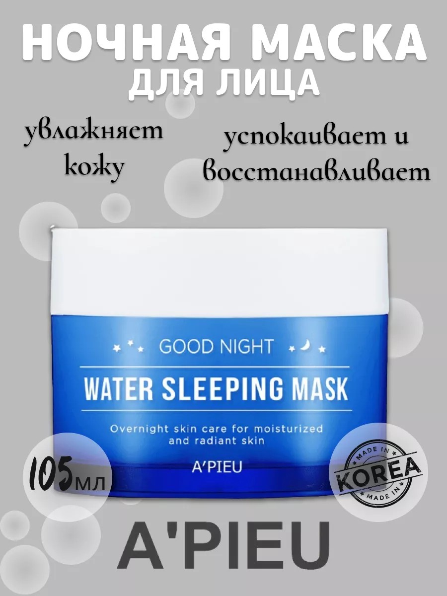 Ночная маска Apieu Good Night Water Sleeping Mask с лёгкой гидрогелевой текстурой увлажнит вашу кожу, успокоит и восстановит в течение ночи. Кожа станет нежной, мягкой, бархатистой на ощупь; цвет лица будет равномерным, отдохнувшим и здоровым; исчезнут покраснения, воспаления станут менее заметными; осветлится пигментация; уменьшатся количество и глубина морщинок. Маска обладает приятной гелевой консистенцией, легко распределяется по коже, не забивает поры, не провоцирует воспаления или раздражения. Основные действующие компоненты Березовый сок (10%) насыщает кожу органическими кислотами, фосфатом кальция и магния, эфирными маслами и витаминами группы В. Успешно используется для лечения различных дерматологических заболеваний. Способствует нормализации гидролипидного баланса и осветлению пигментных пятен. Он является мощным увлажнителем и защищает влагу, находящуюся в глубоких слоях кожи, от преждевременного испарения. Коллаген (10%) способствует выравниванию микрорельефа, разглаживанию небольших морщинок и уменьшению глубины крупных мимических морщин, повышению упругости и эластичности кожи, легкому подтягиванию овала лица, тонизированию кожи. Также гидролизат коллагена обладает ранозаживляющими и успокаивающими свойствами, ускоряет регенерацию поврежденных клеток и восстановление целостности кожного покрова. Экстракт цветов ромашки идеально подходит для ухода за чувствительной и раздраженной кожей, успокаивает, снимает покраснения и раздражение, смягчает, повышает тонус кожи. Экстракт цветов лаванды обладает выраженными антибактериальными свойствами, успокаивает раздражение, снимает воспаления, успокаивает кожу. Подходит для кожи любого типа, которая нуждается в интенсивном увлажнении. Гиалуроновая кислота и гидролизированный коллаген прекрасно освежают кожу, ускоряют обмен веществ, разглаживают появившиеся морщины. Маска поддерживает упругость, препятствует деформации и обвисанию кожи, задерживает влагу в клетках и устраняет кожные заломы, вызванные сухостью.