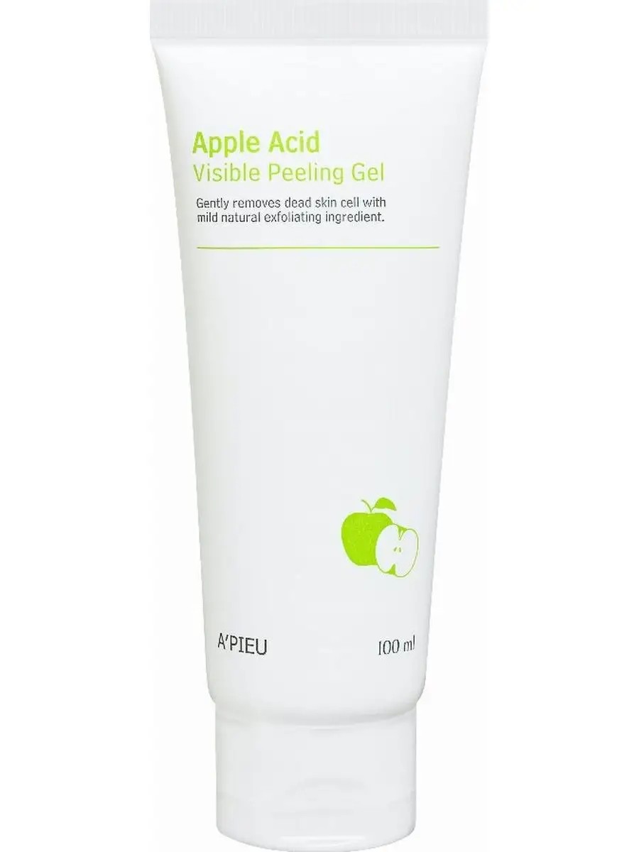 Отшелушивающий пилинг-гель с экстрактом яблока **A'pieu Apple Acid Visible Peeling Gel** делает кожу гладкой, ровной и бархатистой. Эффективно отшелушивает ороговевшие клетки эпидермиса, полирует кожный покров, ускоряет процессы регенерации и восстанавливает повреждённые ткани. Пилинг-скатка позволяет без интенсивного физического воздействия на кожу провести её глубокое очищение, удалить не только мёртвые клетки, но и пыль, остатки косметики, излишки кожного жира. Обладает мягким осветляющим дейтсвием, способствует отбеливанию пигментации и пост-акне, выравнивает общий тон кожи и улучшает цвет лица.## Способ примененияНанесите достаточное количество средства на сухую кожу, мягко массируйте до образования катышек. Смойте пилинг теплой водой.