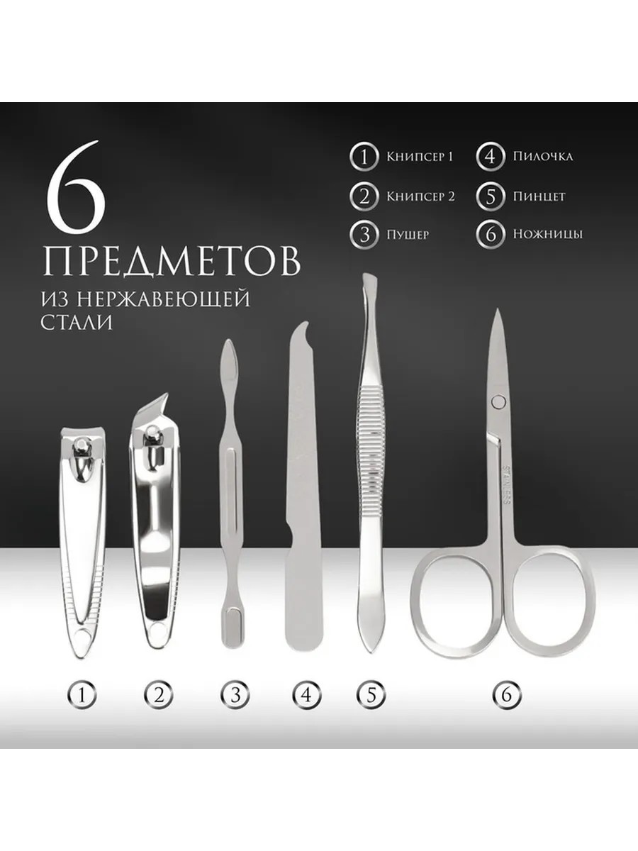 | Комплектация | Набор маникюрный «REAL MAN»; 6 предметов; в футляре; в ПВХ-коробке; разноцветный |