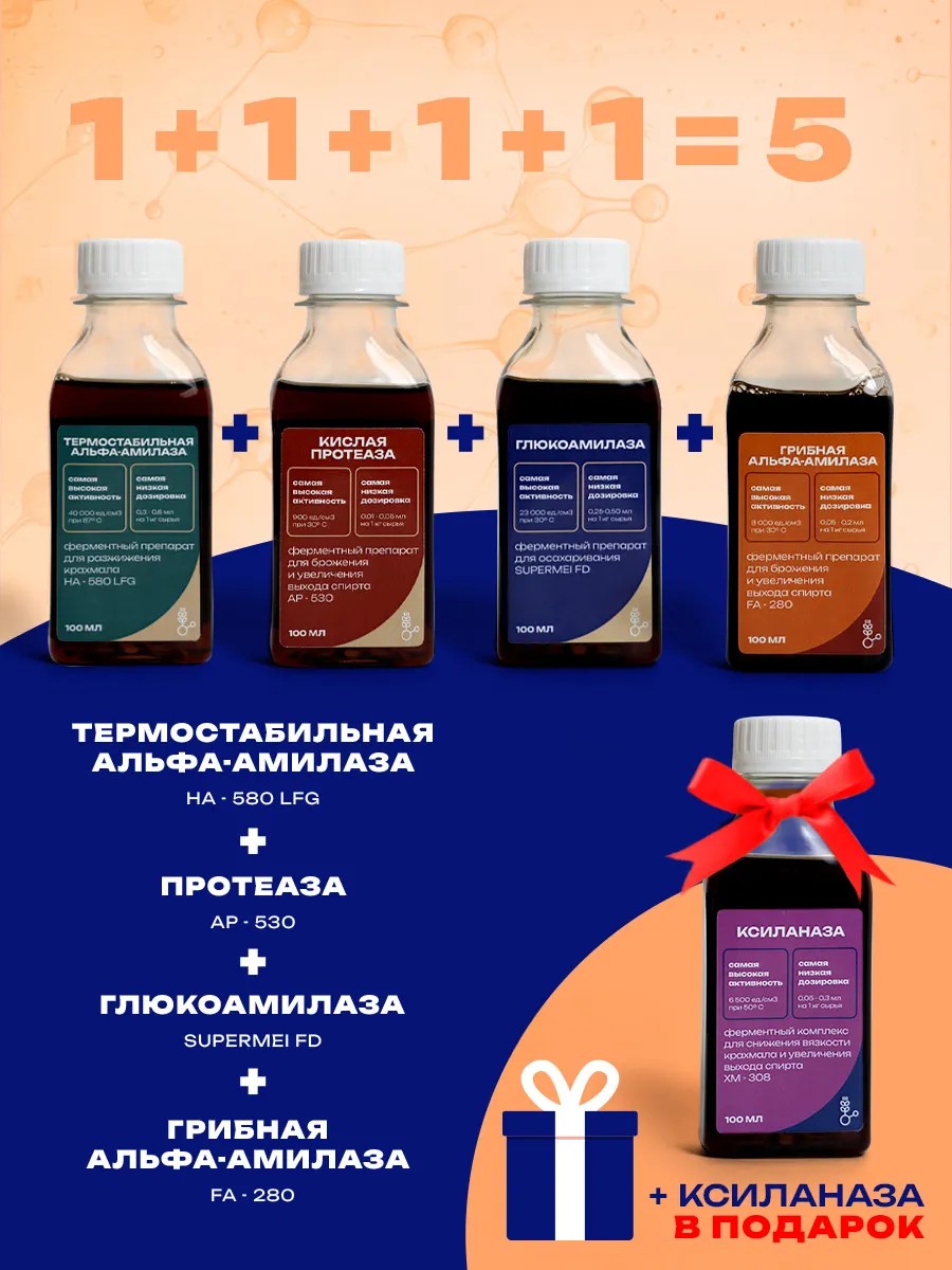 Разведите в воде (не выше 60°C) следующие ферменты: глюкоамилазу Supermei FD, протеазу AP-530, липазу LP-100, альфа-амилазу FA-280 или BAA-400. Добавьте в сусло.