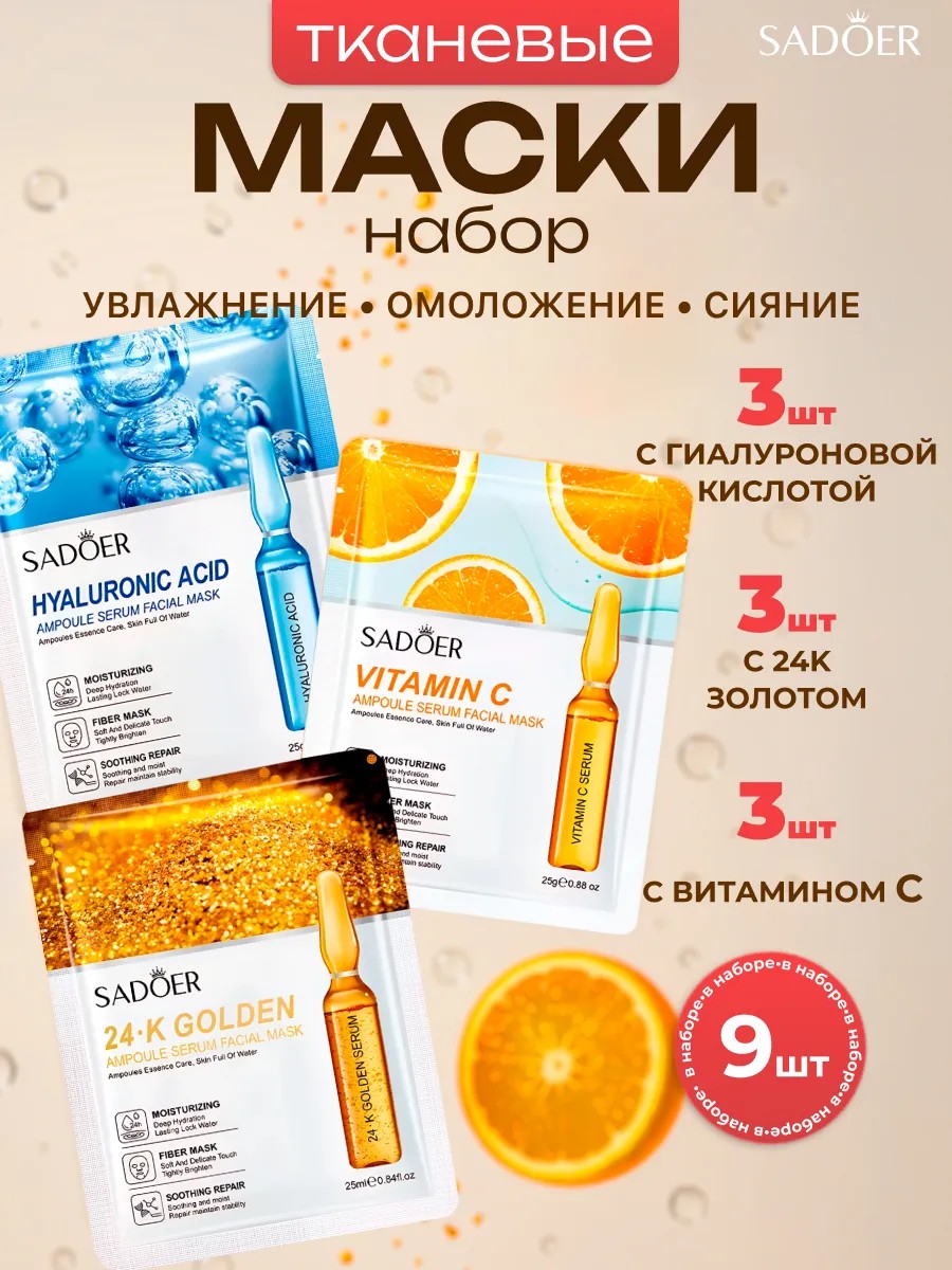 Набор тканевых масок для лица — гиалурон, витамин С и золото