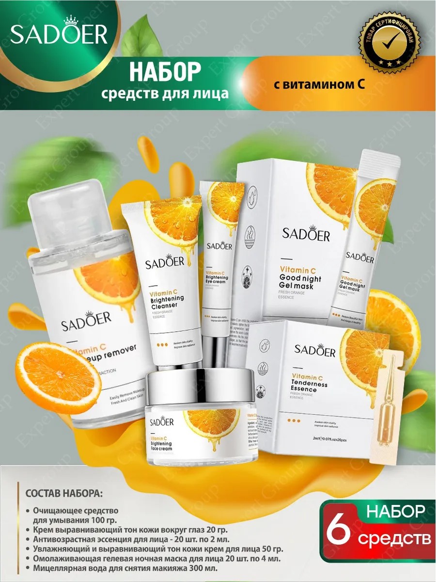 | Комплектация | Набор для лица Sadoer с витамином С Очищающее средство+Крем+Эссенция+Крем+Маска+Мицеллярная вода |