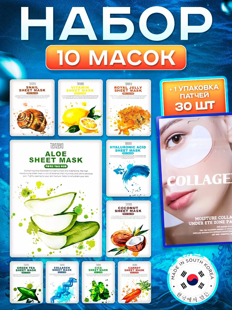 tenzero набор корейских масок для лица (10 шт) TENZERO+патчи