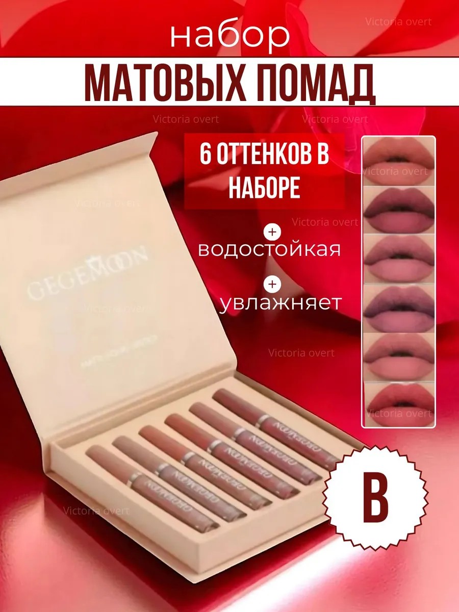 Introducing the GEGEMOON set – a true treasure for women who value quality and style! Inside, you'll find a palette of six delightful shades – from the most delicate nudes to bold reds – allowing you to create an endless number of looks. These liquid lipsticks have an incredible matte texture, provide a velvety finish, and a seductive shine. And for those who love a sparkle, the set also includes a stunning gloss, delivering rich, vibrant tones. Our formula intensely moisturizes, protecting against dryness and flaking. Forget about constantly touching up your makeup – it's long-lasting and will stay put all day long, without leaving marks on your mugs or clothing.