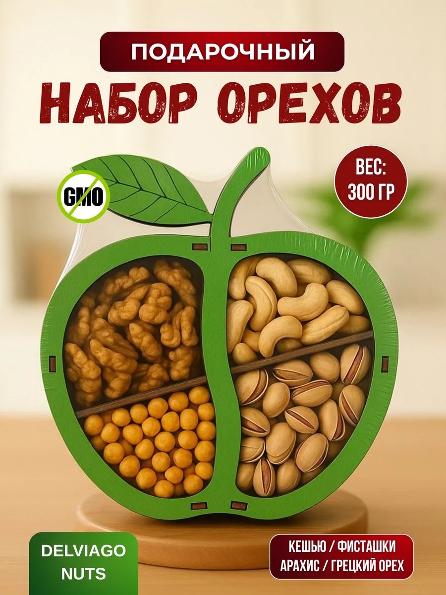 The set contains cashews, pistachios, peanuts, and walnuts—a real storehouse of vitamins, healthy fats, proteins, and minerals.