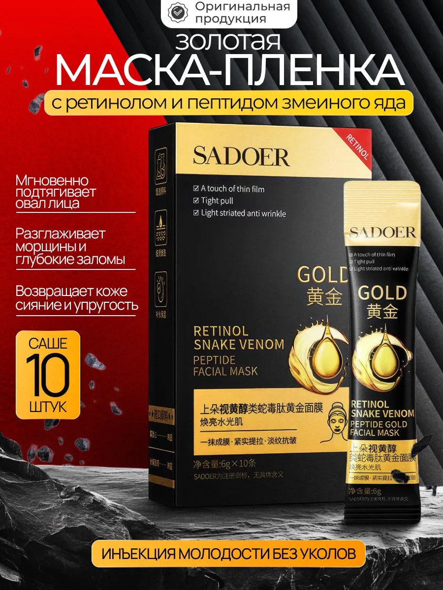 Маски-пленки с уникальными мио-релаксирующими свойствами пептида змеиного яда, регенерирующими свойствами ретинола и полезными свойствами активных ингредиентов. Змеиный пептид - блокирует нервный импульс и снижает способность мышцы к движению, разглаживая мимические морщины и предотвращая появление новых, восстанавливая упругость кожи и ее природную эластичность. Ретинол (Витамин А) - запускает процессы обновления клеток в эпидермисе, обладает мощным восстанавливающим действием, стимулирует выработку коллагена, способствует разглаживанию морщин и удержанию влаги, улучшает тургор кожи, подтягивает овал лица, отбеливает, выравнивает тон и рельеф кожи, защищает от негативного воздействия окружающей среды и солнечного излучения. Способ применения: после очистки лица равномерно нанесите маску избегая глаз и губ. Подождите 15 - 20 минут, чтобы маска полностью высохла. Слегка снять пленку снизу вверх и умыться чистой водой. Состав: вода, полиэтиленгликоль, этанол, глицерин, фитолеиновая кислота, карбом, аллантоин, триэтанол, октановая кислота, ПЭГ-40, змеиный яд, окисляющие бактерии, кунжутное масло, экстракт водорослей, ароматизатор, каприлат глицерина, золото, гидролизованный коллаген, ретинол, спирт, пропиленгликоль, легкий пропилциклодекстрин, аденозин, оксиэтанол, этилгексилглицерин.