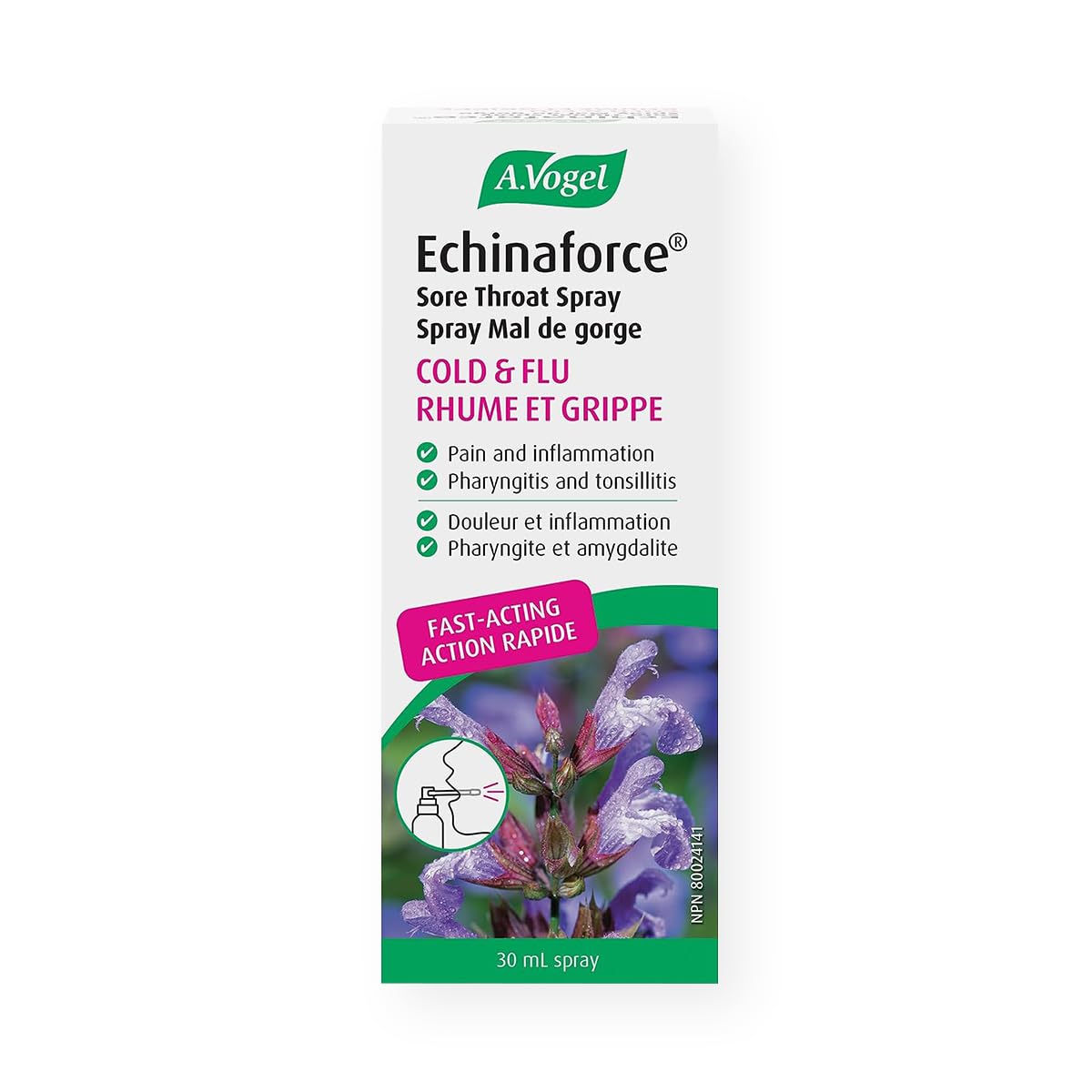Ingredients: Each 1ml of Echinaforce Sore Throat spray contains: 863.3mg of tincture from fresh Echinacea purpurea herb 45.5mg of tincture from fresh Echinacea purpurea root 430mg of tincture from fresh Sage leaves This herbal remedy also contains sorbitol (407mg), ethanol (370mg), soy lecithin (20mg), peppermint oil (5.0mg) and sucrose laurate (5mg). Number of items: 1. fast acting. organic cultivation certified by bio suisse. echinacea purpurea is known for its antiviral, antibacterial and anti-inflammatory properties.