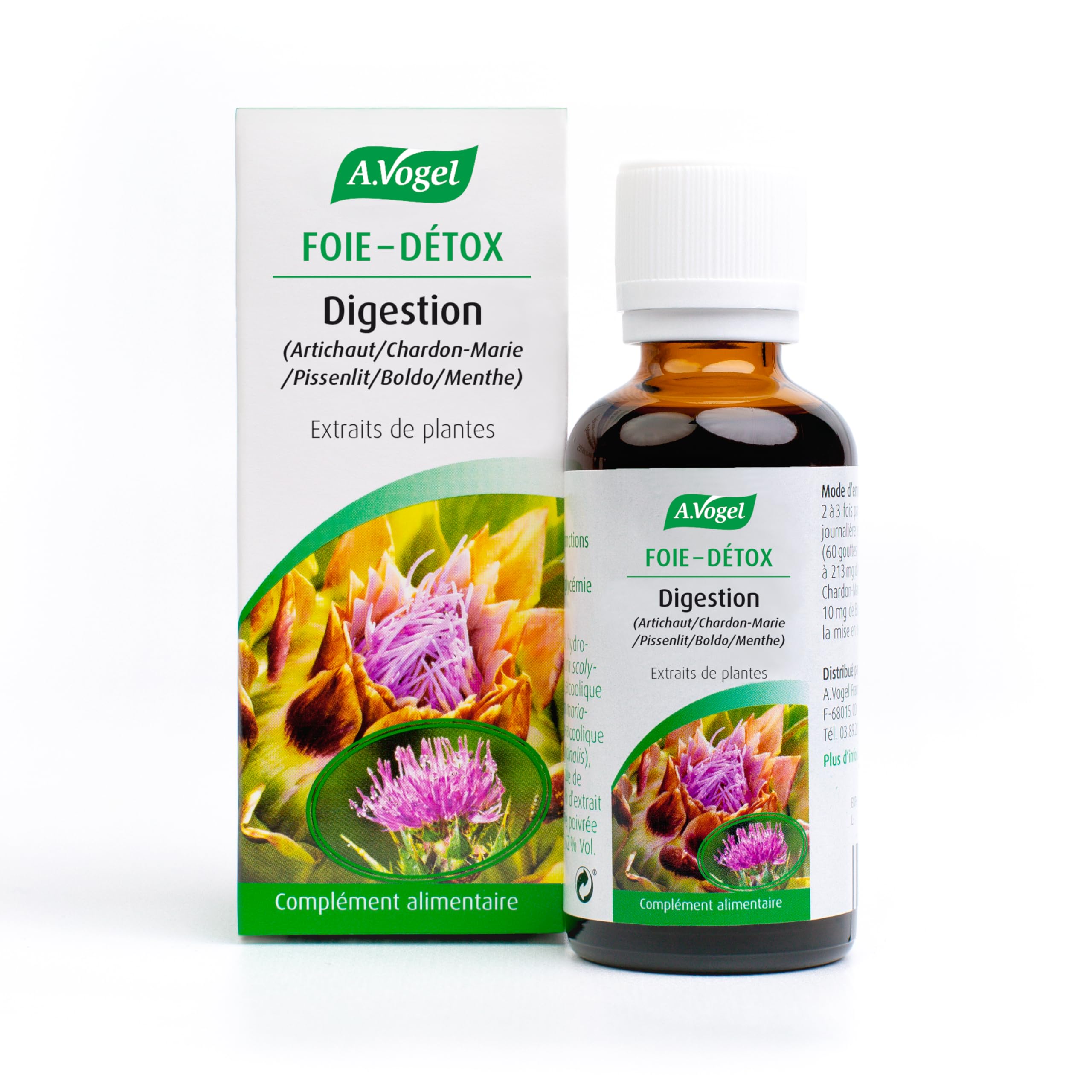 A.Vogel is a range of natural products developed by the Swiss laboratory A.Vogel A.G. Inspired by the work of Alfred Vogel, founder of the company and true pioneer of naturopathy, the brand's food supplements are in perfect harmony with a healthy lifestyle close to nature. Mainly based on fresh plant extracts (EPF) from organic farming, A. Vogel products are formulated to provide you with maximum effectiveness and natural well-being. The Digestion food supplement is a complex of 5 plants known for their beneficial natural actions on the digestive sphere and liver function. Grown organically, the fresh plants used in our formula have a high content of active ingredients. Artichoke and milk thistle are plants known for their ability to stimulate liver activity and promote optimal digestion. Dandelion is a depurative plant which activates the purification of the body by facilitating the drainage of natural emunctories. Boldo and mint support digestive function and improve stomach efficiency. Our highly dosed food supplement provides the equivalent of 108.5 mg of natural plants per day when used. Appreciated in herbal medicine, these plants are ideal for promoting fluid and soothed digestion, particularly when consuming fatty foods. They are useful for people suffering from bloating, stomach aches, heartburn or feelings of heaviness after meals. The Digestion complex is taken as 1 tablet, 2x per day with water, after meals. INGREDIENTS 46 hydro-alcoholic extract of Artichoke (Cynara scolymus), 32 hydro-alcoholic extract of Milk Thistle (Silybum marianum), 12 hydro-alcoholic extract of Dandelion (Taraxacum officinalis), 7 hydro-alcoholic extract of Boldo (Peumus boldus), 3 hydro-alcoholic extract of Peppermint (Mentha piperita). Alcohol: 62 Vol. Fresh organic plants: 22 on average when used. Natural plants: 17 on average upon implementation.NATURAL HEALTH AND EFFECTIVENESS: The A.VOGEL food supplement range takes advantage of the benefits of nature by meticulously selecting plant-based active ingredients that maximize your health and well-being. SUPERIOR QUALITY: Our food supplements are developed in a Swiss laboratory from fresh plants, grown organically on our own land, guaranteeing you unparalleled quality. 100 NATURAL AND ORGANIC: Choosing our liver-detox food supplement means opting for a natural detoxification approach that respects the environment, supports liver health, and guarantees ingredients grown according to strict organic standards. EFFECTIVE SYNERGY: The powerful formula of our food supplement judiciously combines the benefits of several plants. This synergy of ingredients aims to actively support liver function and promote overall well-being. ✓ NATURAL DETOXIFICATION: Our liver detox supplement offers a natural approach to supporting your liver health! A.Vogel est une gamme de produits naturels développée par le laboratoire suisse A.Vogel A.G. Inspirés de l'œuvre d'Alfred Vogel, fondateur de l'entreprise et véritable pionnier de la naturopathie, les compléments alimentaires de la marque sont en parfait accord avec un mode de vie sain et proche de la nature. Principalement à base d'extraits de plantes fraîches (EPF) issues de l'agriculture biologique, les produits A. Vogel sont formulés de manière à vous fournir un maximum d'efficacité et de bien-être au naturel. Le complément alimentaire Digestion est un complexe de 5 plantes réputées pour leurs actions naturelles bénéfiques sur la sphère digestive et la fonction hépatique. Cultivées de manière biologique, les plantes fraîches utilisées dans notre formule affichent une haute teneur en principes actifs. L'artichaut et le chardon-marie sont des plantes reconnues pour leur capacité à stimuler l'activité du foie et à favoriser une digestion optimale. Le pissenlit est une plante dépurative qui active la purification de l'organisme en facilitant le drainage des émonctoires naturels. Le boldo et la menthe soutiennent la fonction digestive et améliorent l'efficacité de l'estomac. Notre complément alimentaire hautement dosé procure par jour l'équivalent de 108,5 mg de plantes naturelles à la mise en œuvre. Appréciées en phytothérapie, ces plantes sont idéales pour favoriser une digestion fluide et apaisée, en particulier lors de la consommation d'aliments gras. Elles s'avèrent utiles chez les personnes souffrant de ballonnements, maux de ventre, brûlures gastriques ou de sensations de lourdeur après les repas. Le complexe Digestion se prend à raison de 1 comprimé, 2x par jour avec de l'eau, après les repas. INGRÉDIENTS 46 d'extrait hydro-alcoolique d'Artichaut (Cynara scolymus), 32 d'extrait hydro-alcoolique de Chardon-Marie (Silybum marianum), 12 d'extrait hydro-alcoolique de Pissenlit (Taraxacum officinalis), 7 d'extrait hydro-alcoolique de Boldo (Peumus boldus), 3 d'extrait hydroalcooliquede Menthe poivrée (Mentha piperita). Alcool : 62 Vol. Plantes fraîches biologiques : 22 en moyenne à la mise en oeuvre. Plantes naturelles : 17 en moyenne à la mise en oeuvre.SANTE ET EFFICACITE NATURELLE : La gamme complément alimentaire A.VOGEL tire parti des bienfaits de la nature en sélectionnant méticuleusement des actifs végétaux qui maximise votre santé et votre bien-être. QUALITE SUPERIEURE : Nos complément alimentaire sont élaborés dans un laboratoire suisse à partir de plantes fraîches, cultivées de manières biologique sur nos propres terrains vous garantissant une qualité inégalée. 100 NATUREL ET BIO : Choisir notre complément alimentaire foie-détox, c'est opter pour une approche de détoxification naturelle qui respecte l'environnement, soutient la santé du foie, et garantit des ingrédients cultivés selon des normes biologiques strictes. SYNERGIE EFFICACE : La formule puissante de notre complément alimentaire combine judicieusement les bienfaits de plusieurs plantes. Cette synergie d'ingrédients vise à soutenir activement la fonction hépatique et à favor