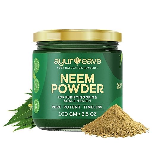 GENEROUS SIZE: Contains 100 grams (3.5 ounces) of pure neem powder, providing multiple applications for face masks, hair treatments, and skincare routines. POTENT AND TIMELESS FORMULA: Finely ground powder from premium neem leaves delivers concentrated benefits following traditional Ayurvedic practices. SCALP HEALTH SUPPORT: Nourishes scalp and hair follicles, helps maintain healthy scalp conditions, and can be mixed with oils or water for hair treatments. SKIN PURIFYING PROPERTIES: Helps cleanse and purify skin, supports clear complexion, and promotes healthy-looking skin when used as a face mask or paste. 100 NATURAL NEEM POWDER: Pure neem leaf powder with no additives, fillers, or artificial ingredients for authentic Ayurvedic skincare and haircare benefits.