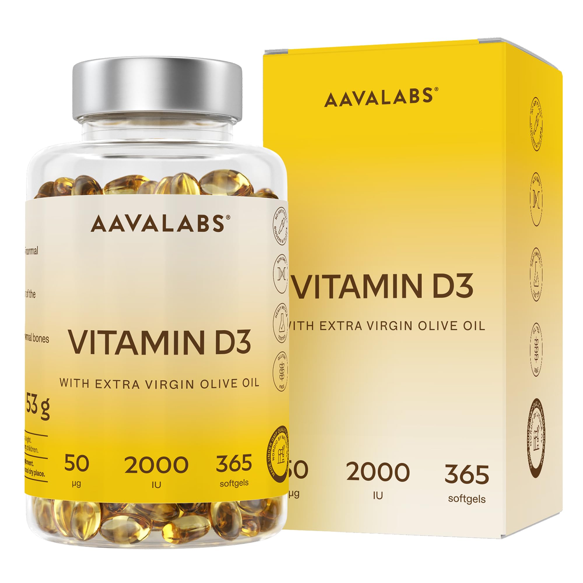 AAVALABS Vitamin D3 2000 IE With extra virgin olive oil for optimal absorption GMO gluten and lactose free Contributes to bone muscle and immune function 365 Vitamin D Softgel capsules