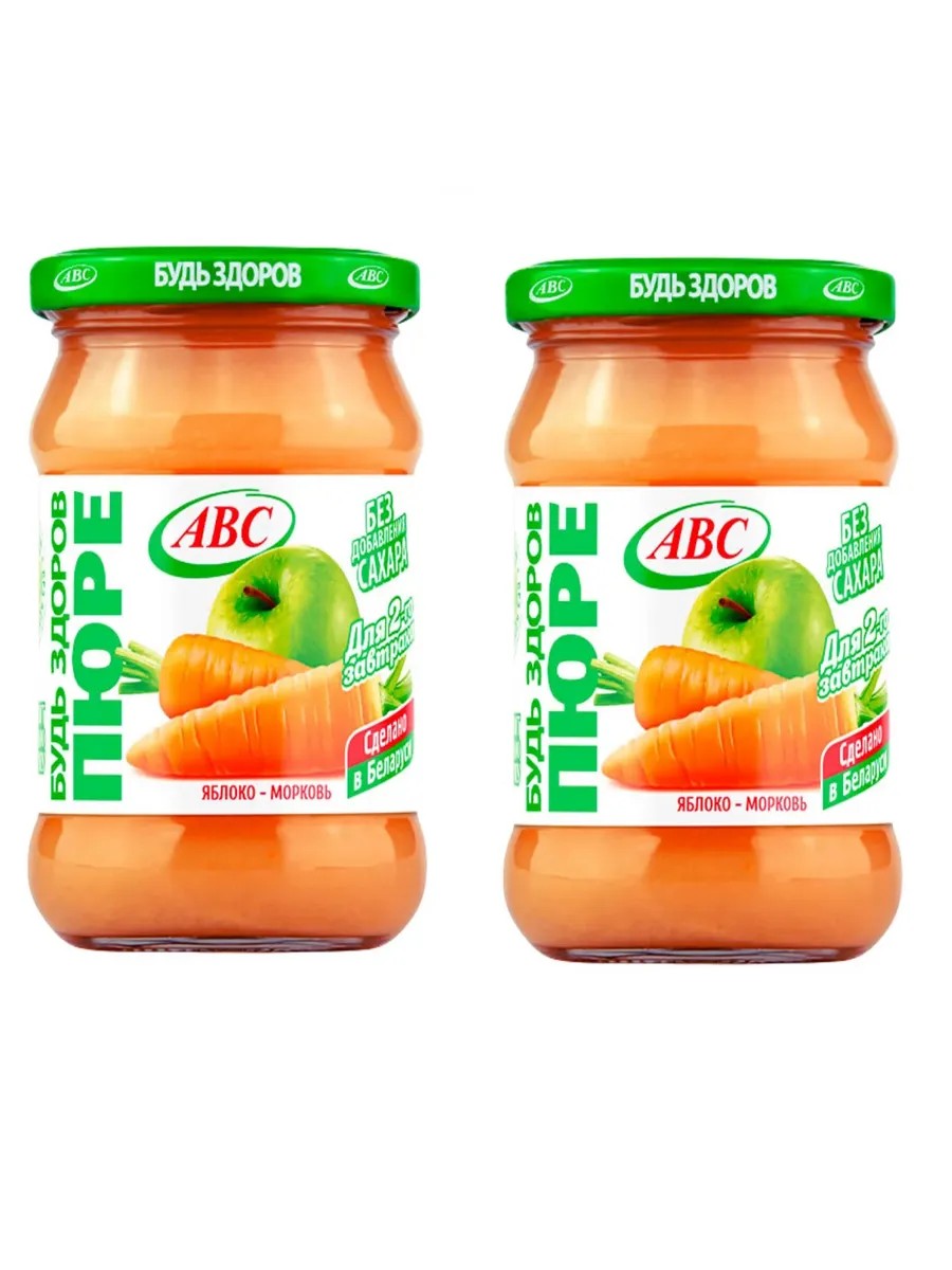 АВС, Пюре яблочно-морковное 450 г, 2 штуки. Яблочно-морковное пюре обладает ярким, сладковатым вкусом и освежающим ароматом. Яблоки добавляют свою приятную кислинку, а морковь дарит неповторимый вкус и легкую текстуру. Пюре наполнено витаминами и питательными элементами, не содержит сахара и консервантов, невероятно полезный десерт для всей семьи! Состав: пюре из яблок (яблоки, антиокислитель аскорбиновая кислота), пюре из моркови.