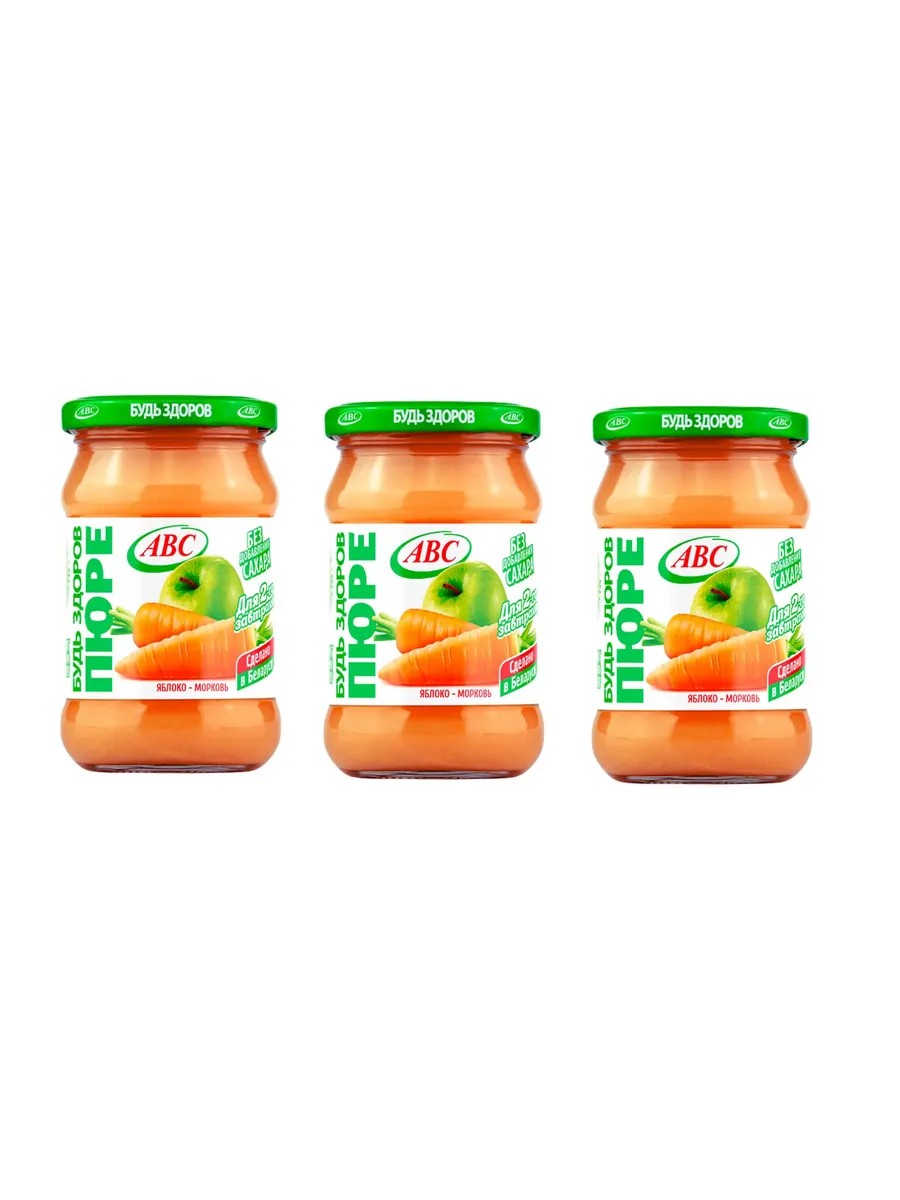 АВС, Пюре яблочно-морковное 450 г, 3 штуки. Яблочно-морковное пюре обладает ярким, сладковатым вкусом и освежающим ароматом. Яблоки добавляют свою приятную кислинку, а морковь дарит неповторимый вкус и легкую текстуру. Пюре наполнено витаминами и питательными элементами, не содержит сахара и консервантов, невероятно полезный десерт для всей семьи! Состав: пюре из яблок (яблоки, антиокислитель аскорбиновая кислота), пюре из моркови.