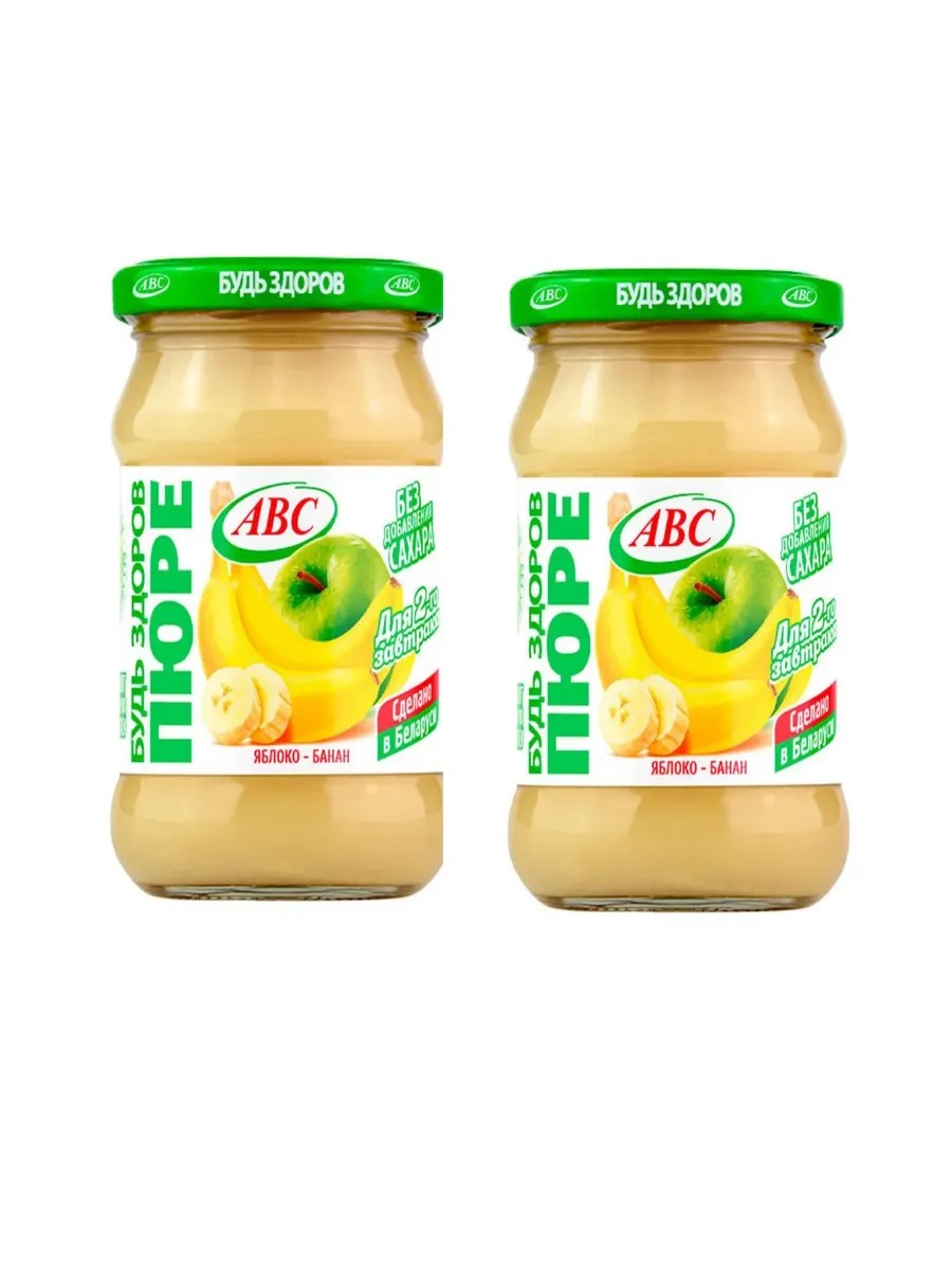 АВС, Пюре яблочно-банановое 450 г, 2 штуки. Яблочно-банановое пюре — это сладкое и ароматное блюдо, без добавления сахара, которое хорошо подходит для завтрака или в качестве полезного десерта. Природная сладость банана балансируется легкой кислинкой яблок, создавая гармоничный вкус и аромат. Пюре хорошо сочетается с йогуртом, овсянкой или гранолой.