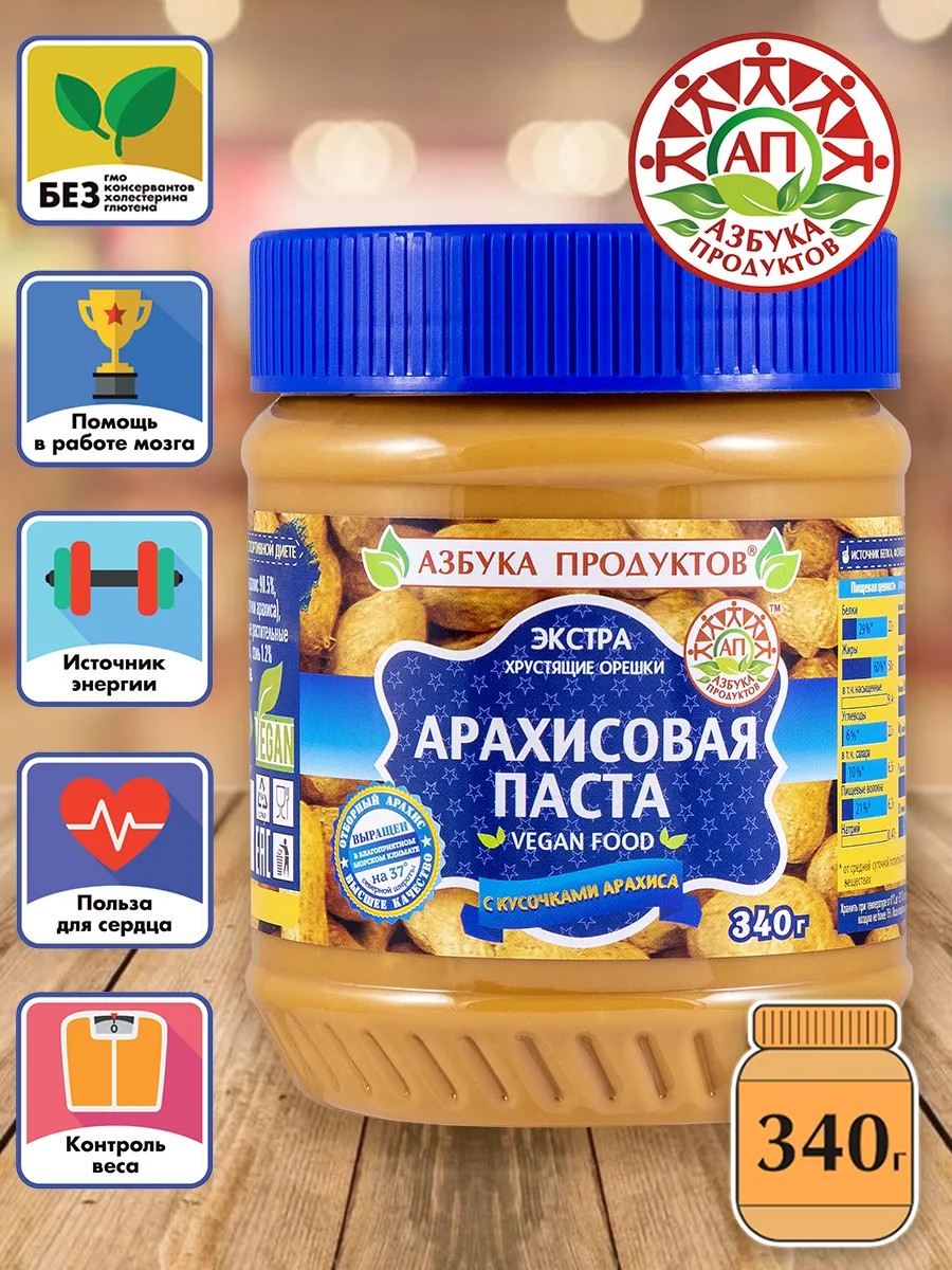 АРАХИСОВАЯ ПАСТА АЗБУКА ПРОДУКТОВ с кусочками дробленого арахиса в баночке 340г — ПОЛЕЗНЫЙ И ПИТАТЕЛЬНЫЙ ПРОДУКТ.