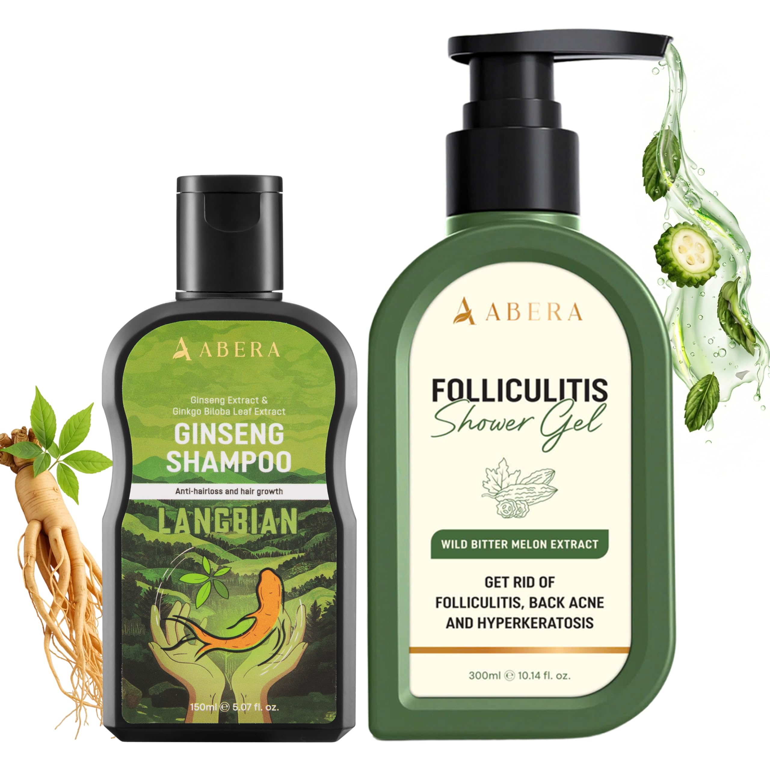 ABERA Folliculitis Body Wash for Men & Women High-Performance Shower Gel with BHA Wild Bitter Melon & Tea Tree 1 Box + Ginseng Anti Dandruff Shampoo Scalp Fungus Treatment Reduce Itching (Set 2) D. Set 2