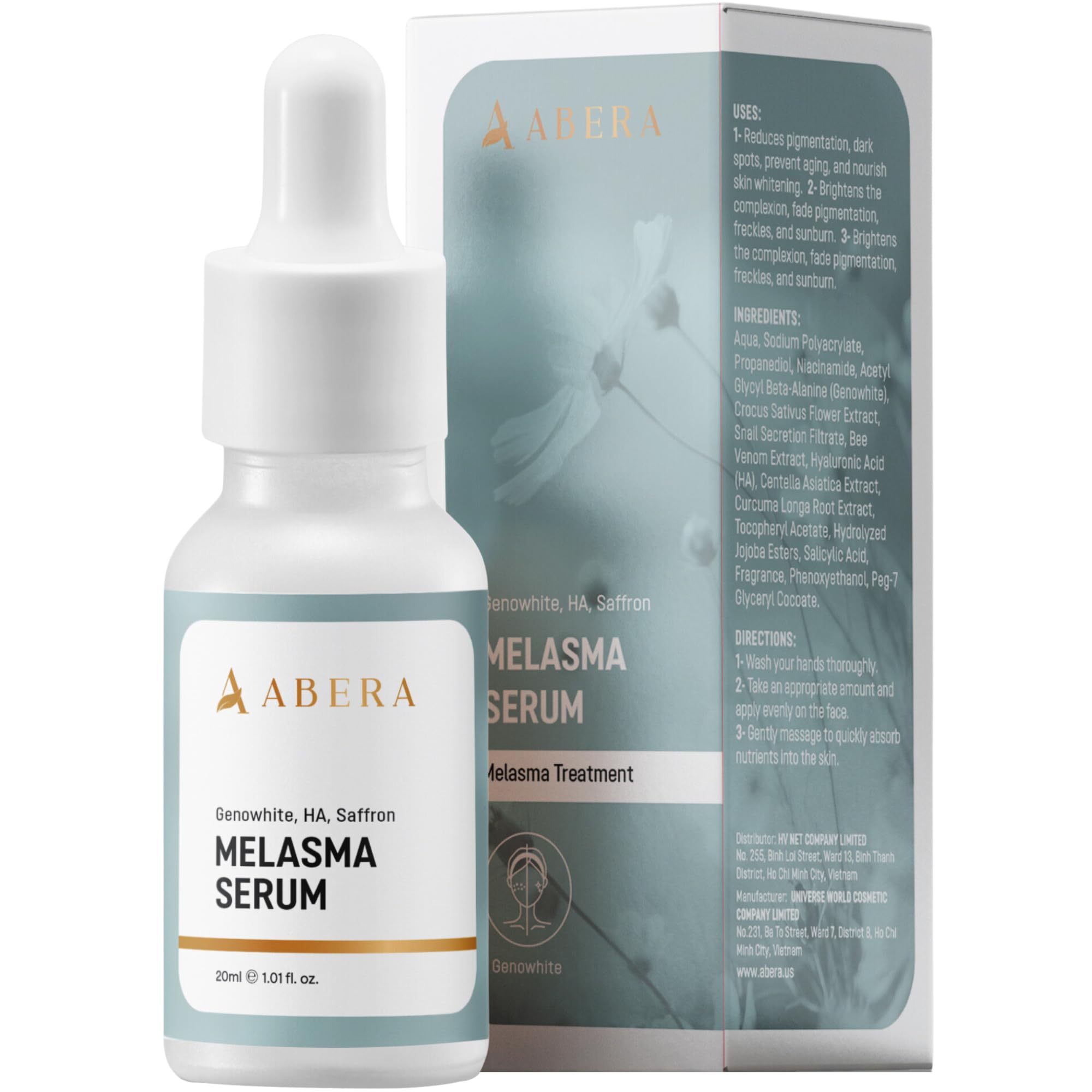 Why this serum is not effective: Reducing melasma is a long process, depending on each person's skin constitution and melasma condition, it may take longer to see the effect of melasma reduction, and combining daily sun protection is very important. Melasma Reduction Routine: Integrate our serum into your daily skincare regimen. Apply morning and night after cleansing, and emphasize daily sun protection for optimal effectiveness in reducing melasma. Suitable for All Skin Tones: Tailored for both men and women, our premium melasma serum adapts to all skin tones. Gradually increase usage for accelerated results, with significant transformations promised after 4 - 8 weeks of consistent application. Professional Ingredients: Abera Melasma Serum is formulated with a meticulously crafted blend of Genowhite, Niacinamide, Bee Venom Extract, Hyaluronic Acid (HA) effectively penetrates deep into the skin to reduce melanin pigments that cause melasma. Melasma Treatment for Face: Experience the potency of our melasma serum, meticulously crafted to reduce melasma, dark spots, pregnancy spots, hyperpigmentation and freckles. Witness a reduction in melasma, revealing a radiant complexion.