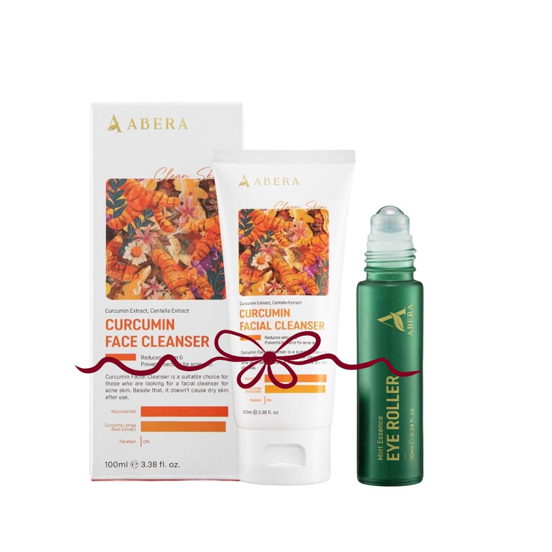 Discover the natural glow of healthy skin with the ABERA Turmeric Face Cleanser Eye Roller Duo — your simple 2-step daily skincare ritual. Designed to gently purify, balance, and refresh, this combo helps you start and end your day with calm, radiant skin. Step 1 – Turmeric Curcumin Face Cleanser Formulated with Curcumin, Centella Asiatica, Niacinamide, and BHA, this mild foaming cleanser deeply removes dirt, oil, and makeup while keeping your skin soft and hydrated. Turmeric helps calm redness and brighten dull skin, leaving your face fresh, clean, and glowing — without dryness or tightness. Step 2 – Cooling Eye Roller Serum Enriched with Caffeine, Peptides, and Hyaluronic Acid, this refreshing serum targets dark circles and puffiness. The metal roller applicator provides a cooling massage, helping to smooth and awaken the eye area for a well-rested look.Powered by Nature, Perfected by ABERA: Made with turmeric and botanical extracts to help calm, brighten, and refresh your skin every day. Gentle, Non-Comedogenic Sulfate-Free: Perfect for sensitive and combination skin. Maintains a balanced pH level and leaves your skin smooth, hydrated, and healthy-looking after every use. Cooling Eye Roller Serum for Dark Circles Puffiness: Contains Caffeine, Peptides Hyaluronic Acid to depuff, brighten, and hydrate the delicate under-eye area while the metal roller refreshes tired eyes. Turmeric Curcumin Face Cleanser for Acne-Prone Skin: Infused with Curcumin, Centella Asiatica, Niacinamide BHA, it deeply cleans pores, reduces excess oil, and soothes redness without stripping moisture. 2-Step Skincare Routine for Clear, Bright Skin: Complete daily set featuring the ABERA Turmeric Face Cleanser and Cooling Eye Roller Serum — designed to purify, calm, and refresh from face to eyes.