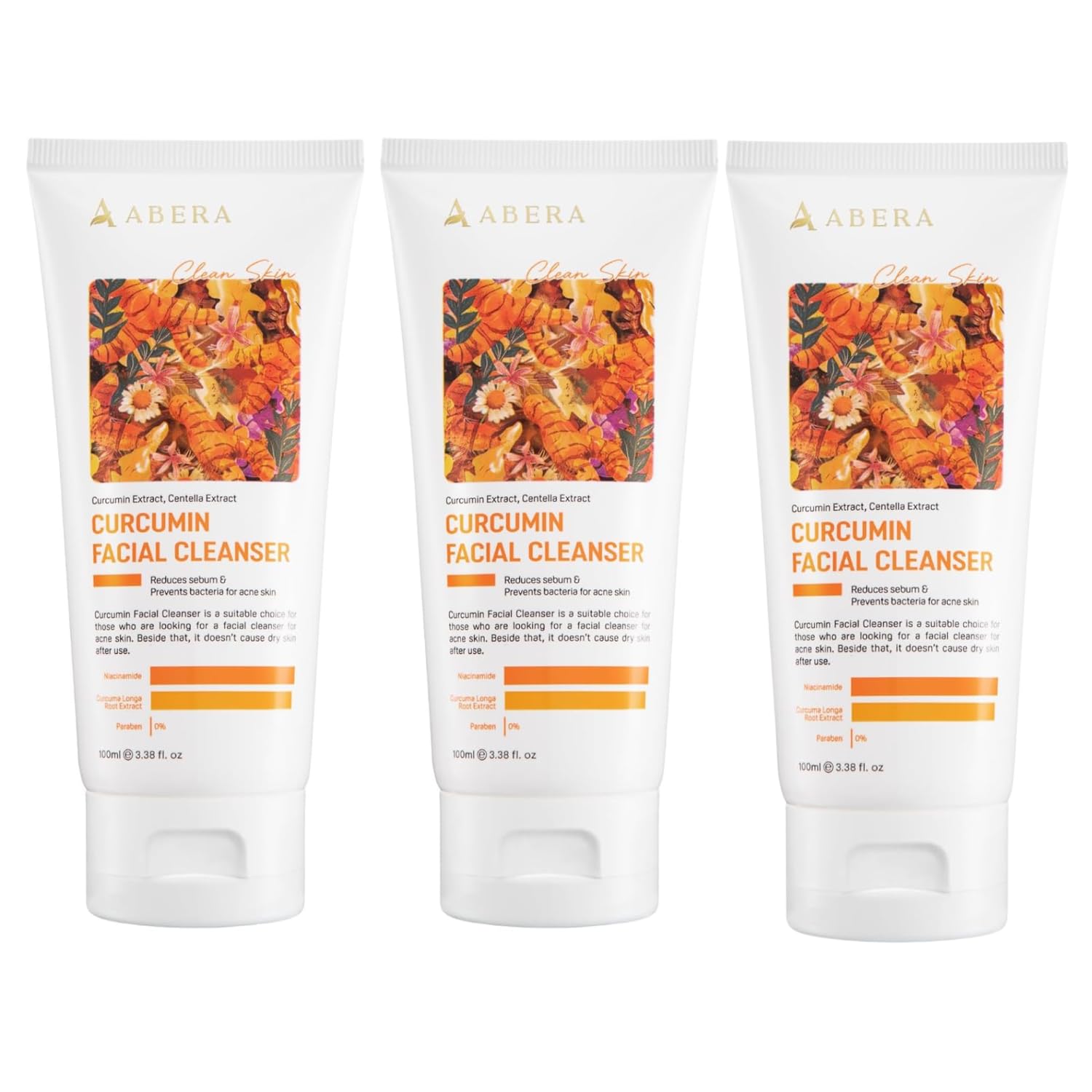 Abera Curcumin Facial Cleanser is a premium turmeric face wash created for acne-prone and sensitive skin. The advanced 4-in-1 formula combines Curcumin, Niacinamide, BHA, and Centella to help cleanse pores, control oil, brighten skin tone, and calm irritation in one step. With a pH of 4.5–5.5 and dermatologist-tested, this facial cleanser is gentle enough for daily use while supporting the skin barrier. It removes impurities effectively without leaving dryness or tightness. Formulated to meet clean beauty standards, it is non-comedogenic, sulfate free, paraben free, and free from silicones, mineral oils, and synthetic fragrance. The non-staining turmeric blend makes it safe and convenient for both men and women. Make it the first step of your skincare ritual – a cleanser that blends natural tradition with modern skincare science to support clearer, brighter-looking skin every day.Herbal Meets Science: A turmeric-based facial cleanser designed for both men and women, blending natural tradition with modern skincare innovation. Clean Beauty Standard: Non-comedogenic and free from parabens, sulfates, silicones, mineral oils, and artificial fragrance. Safe for daily use. Brightening Calming: With consistent use, it may help reduce the look of blemishes, calm redness, and promote a more even, radiant skin tone. Gentle for Sensitive Skin: pH balanced at 4.5–5.5 and dermatologist-tested, this cleanser supports the skin barrier while leaving skin refreshed, not dry or tight. 4-in-1 Advanced Formula: Combines Curcumin, Niacinamide, BHA, and Centella to help cleanse pores, reduce oil, brighten skin, and soothe irritation in one step.