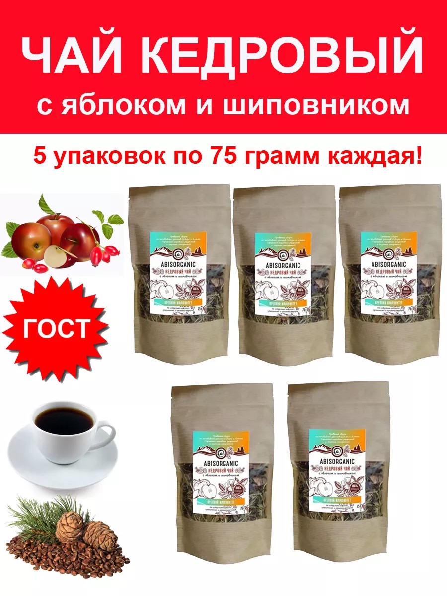 Вы получаете 5 упаковок "Кедровый чай с яблоком и шиповником" весом 75 грамм каждая упаковка!