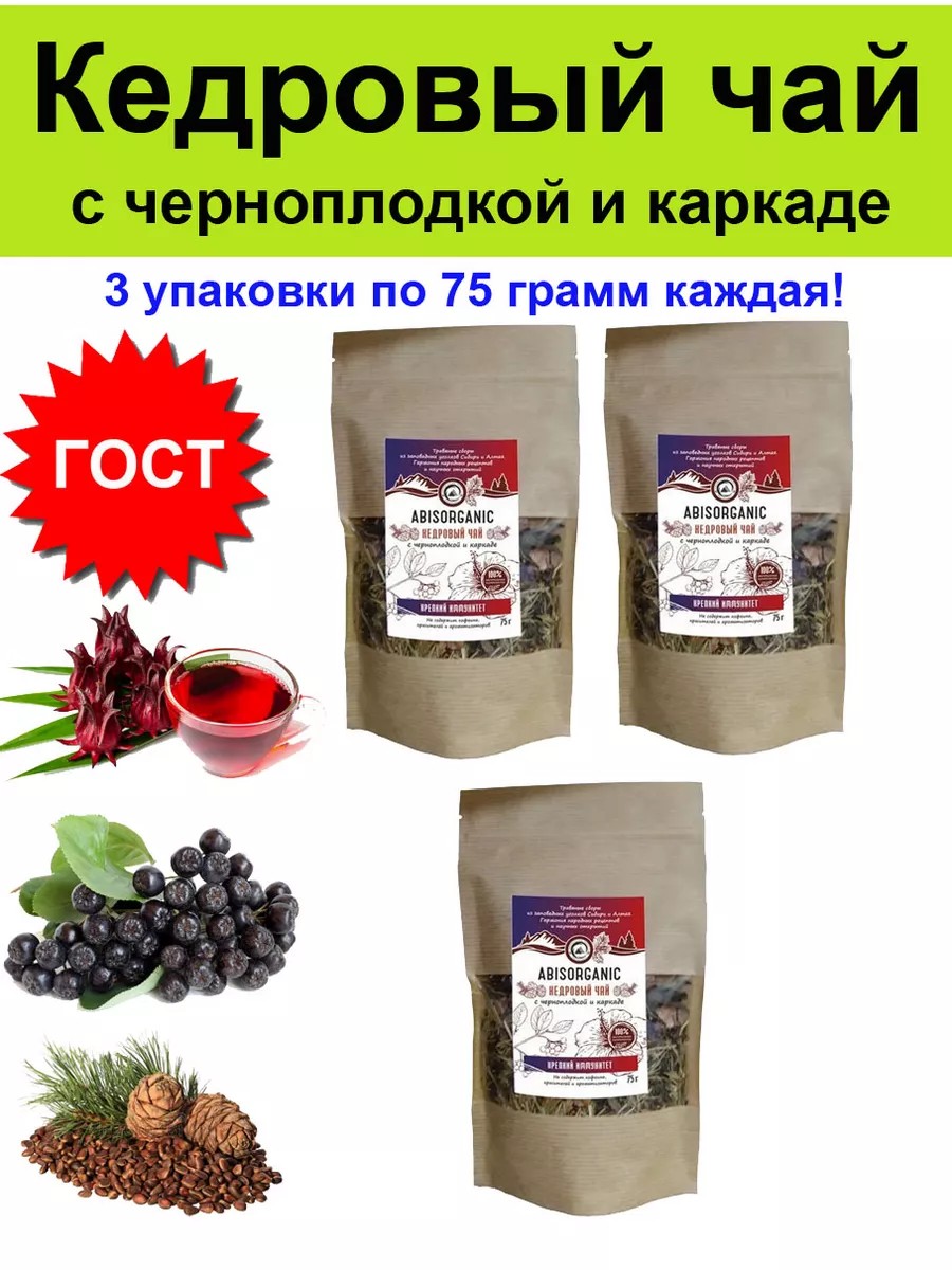 Вы получаете 3 упаковки "Кедровый чай с черноплодкой и каркаде", каждая упаковка весит 75 грамм!