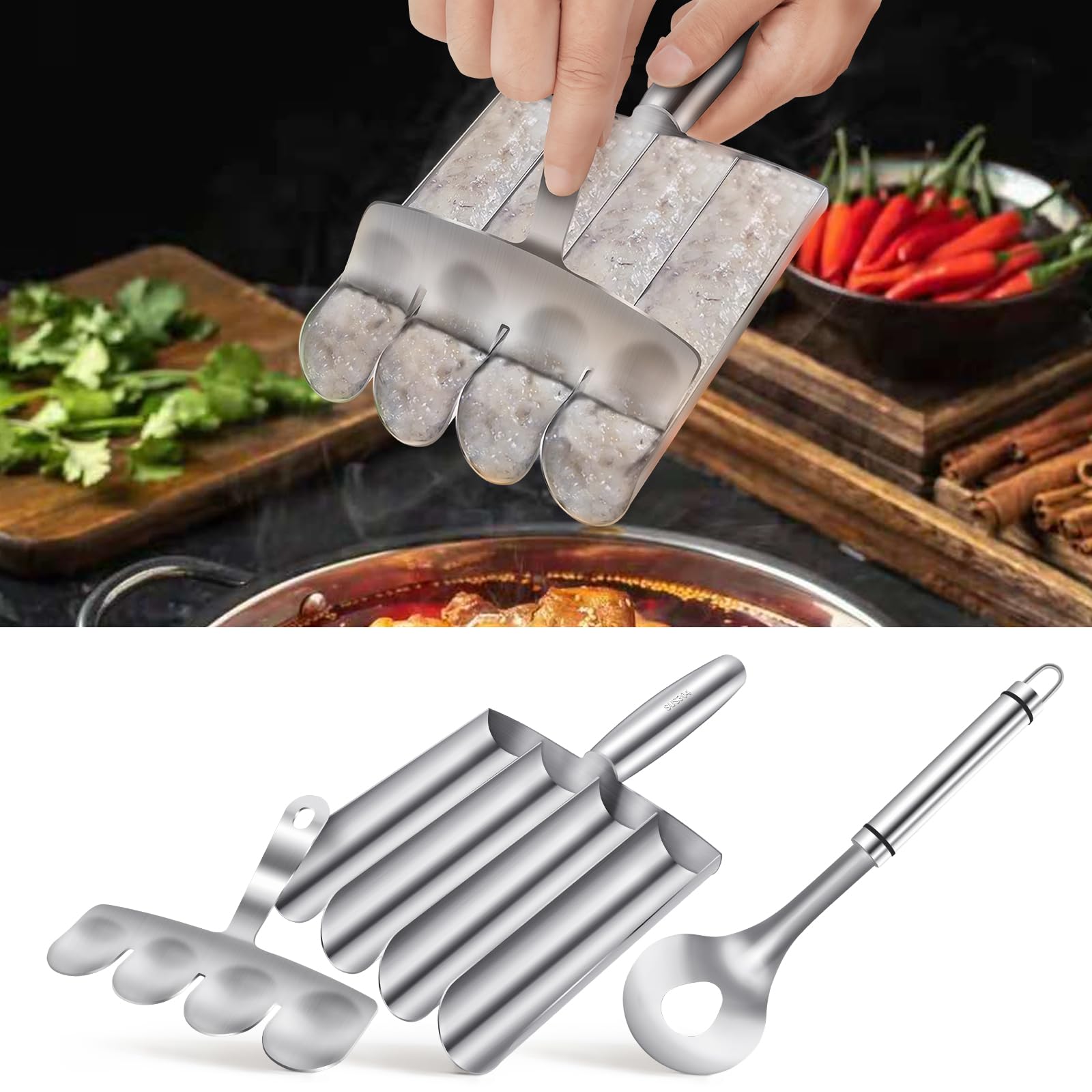 Parts List: 1 x meatball maker 1 x scraper 1 x double string meatball spoon Product Specification: Description: This product is safe, beautiful and strong, and is a good kitchen appliance. You just need to evenly spread the contents in the meatball mold, and then scrape off with the nozzle, you can make delicious meatballs relatively quickly. This product can be washed in the dishwasher or easily washed by hand. Key Feature: Easy to Use: Just apply the contents evenly in the meatball mold, and then scrape off with the nozzle, you can make delicious meatballs relatively quickly. Large Capacity: The meatball tool can hold up to 1 pound of filling at a time, allowing you to make meatballs quickly and proper for family dinners. Specification: Product Name: Meatball Maker Tool Material: Stainless steel Dimensions: Meatball maker 24 x 14.6 cm, spatula 11.6 x 14 cm, spoon length 25 cm Note: 1. There may be slight color differences between the product picture and the actual item. We will do our best to display the color as accurately as possible. 2. Please allow slight dimensional discrepancies due to manual measurement.( _ ) Easy to Use: Just apply the contents evenly in the meatball mold, and then scrape off with the nozzle, you can make delicious meatballs relatively quickly. ( _ ) Easy to Clean: This product can be placed in the dishwasher. Its stainless steel surface is bright and smooth, can be easily cleaned by hand. ( _ ) Versatile: In addition to meatballs, this meatball tool can also be used to make fish balls, shrimp balls and vegetable meatballs, making it easy to make different types of food. ( _ ) Large Capacity: The meatball tool can hold up to 1 pound of filling at a time, allowing you to make meatballs quickly and it is proper for family dinners. ( _ ) Safe Material: It is made of 304 stainless steel. This makes the product healthy, beautiful and strong, and it is the nice choice for kitchen utensils.