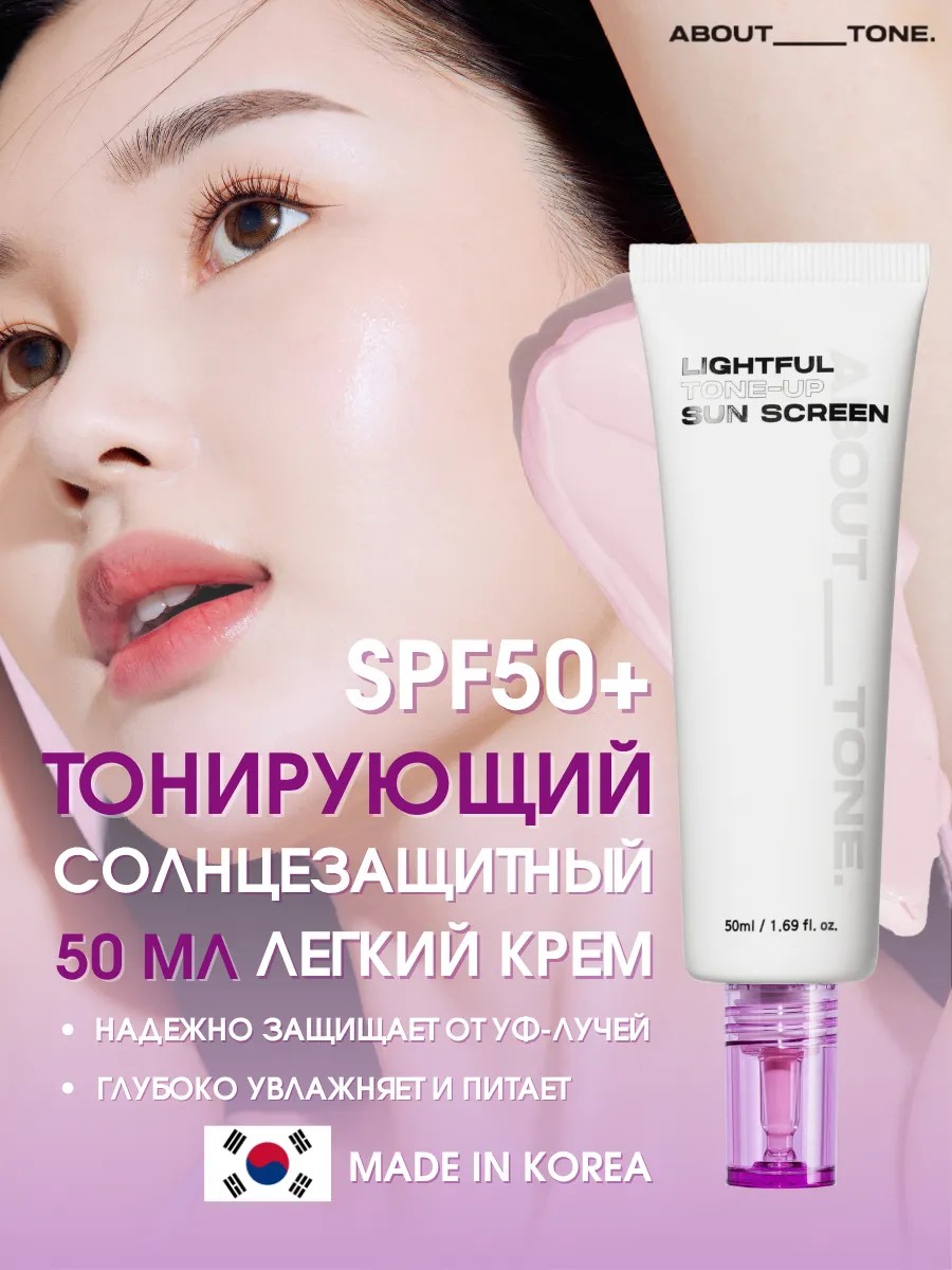 Солнцезащитный крем ABOUT TONE Lightful Tone Up Sun Screen с спф 50 не только защищает кожу от фотостарения и образования пигментации, но также работает как тональный крем. Он выравнивает тон, подсвечивает кожу изнутри, дарит ей свежий отдохнувший вид. Лёгкая текстура не липнет, подходит под макияж, не скатывается и не ползет в течение всего дня. Крем на смешанных фильтрах содержит 5 видов гиалуроновой кислоты, растительный комплекс из успокаивающих трав и ниацинамид. Эти компоненты интенсивно увлажняют кожу, запирают в ней влагу, снимают покраснения и раздражения, выравнивают рельеф кожи, работают против расширенных пор и чёрных точек. Санскрин с лёгкостью заменит дневной крем и тональную основу. Ощутите на себе всю мощь корейской косметики, добавьте в свой уход удобный, полезный и эффективный продукт.