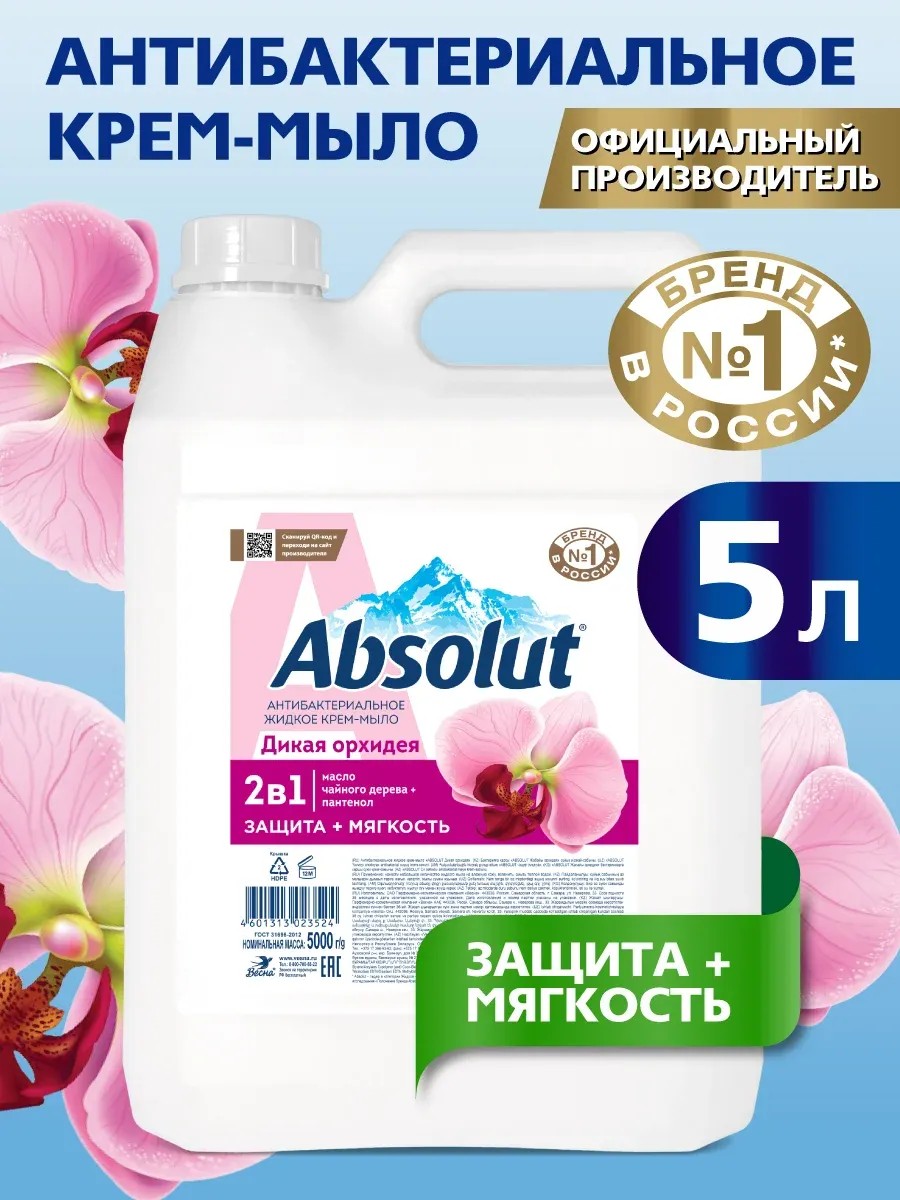 Жидкое мыло 5 литров антибактериальное Absolut с ароматом Дикая Орхидея - поддержание гигиены и заботы о коже рук. Удобный экономичный формат упаковки канистры на 5000г, который подходит как для дома, так и для офиса.