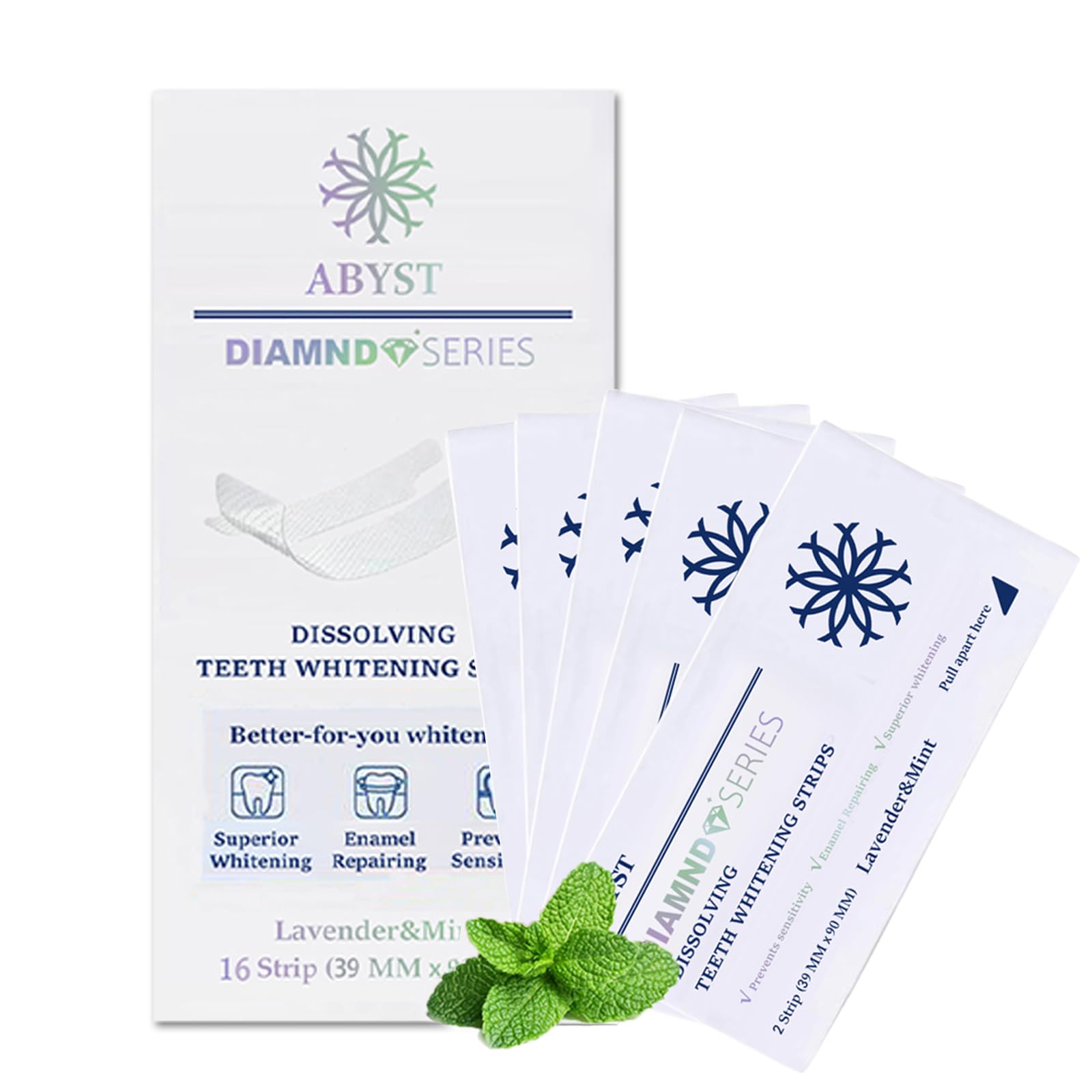 [Dental Care Products]:Since 2016, we have been dedicated to creating innovative oral care products that provide professional-grade results. We also offer a 60-day satisfaction guarantee for your peace of mind. [Safe Gentle Care for Sensitive Teeth]: ABYST Diamond Dissolving Teeth Whitening Strips offer gentle and safe care for sensitive teeth. Enriched with Nano-Hydroxyapatite, these whitening strips for sensitive teeth strengthen and shield enamel while brightening your smile. Experience whitening without irritation, ensuring an effective and soothing treatment for sensitive teeth. [Convenient Fast Teeth Whitening Results]: Enjoy fast and simple whitening results with our dissolvable strips. Tailored for those on the go, these teeth whitening products provide quick whitening wherever and whenever you need it. No fuss, no mess—just peel, apply, and let the strips melt away, unveiling a whiter, radiant smile in minutes. [Professional Teeth Whitening]: Experience professional-grade teeth whitening from the comfort of your home with our Diamond Dissolving Whitening Strips. These strips are enriched with hydroxyapatite to fortify enamel, while our advanced technology eliminates stubborn stains. Achieve a bright smile effortlessly with this powerful and convenient solution. [Fresh Breath Clean Finish]: Enjoy a refreshing breath and a polished feel with our peppermint and lavender-flavored whitening strips. These teeth whitening strips not only brighten your smile but also leave your mouth feeling revitalized. The natural flavors elevate your oral care routine, turning teeth whitening into a delightful part of your day.