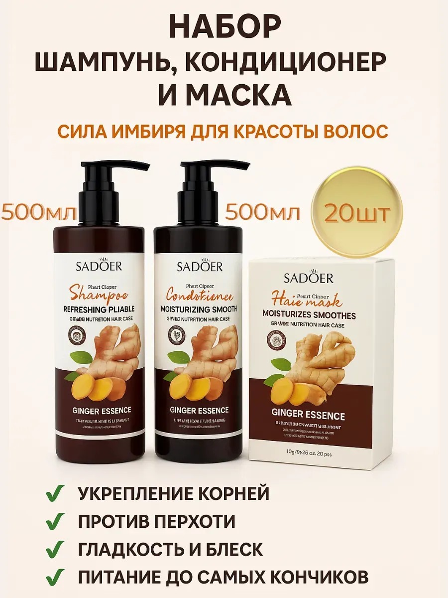 Набор для ухода за волосами — это профессиональная косметика для восстановления и питания волос на основе натурального экстракта имбиря. В комплект входят шампунь, кондиционер и маска для волос, которые комплексно ухаживают за волосами, укрепляют корни, увлажняют и придают сияющий блеск.