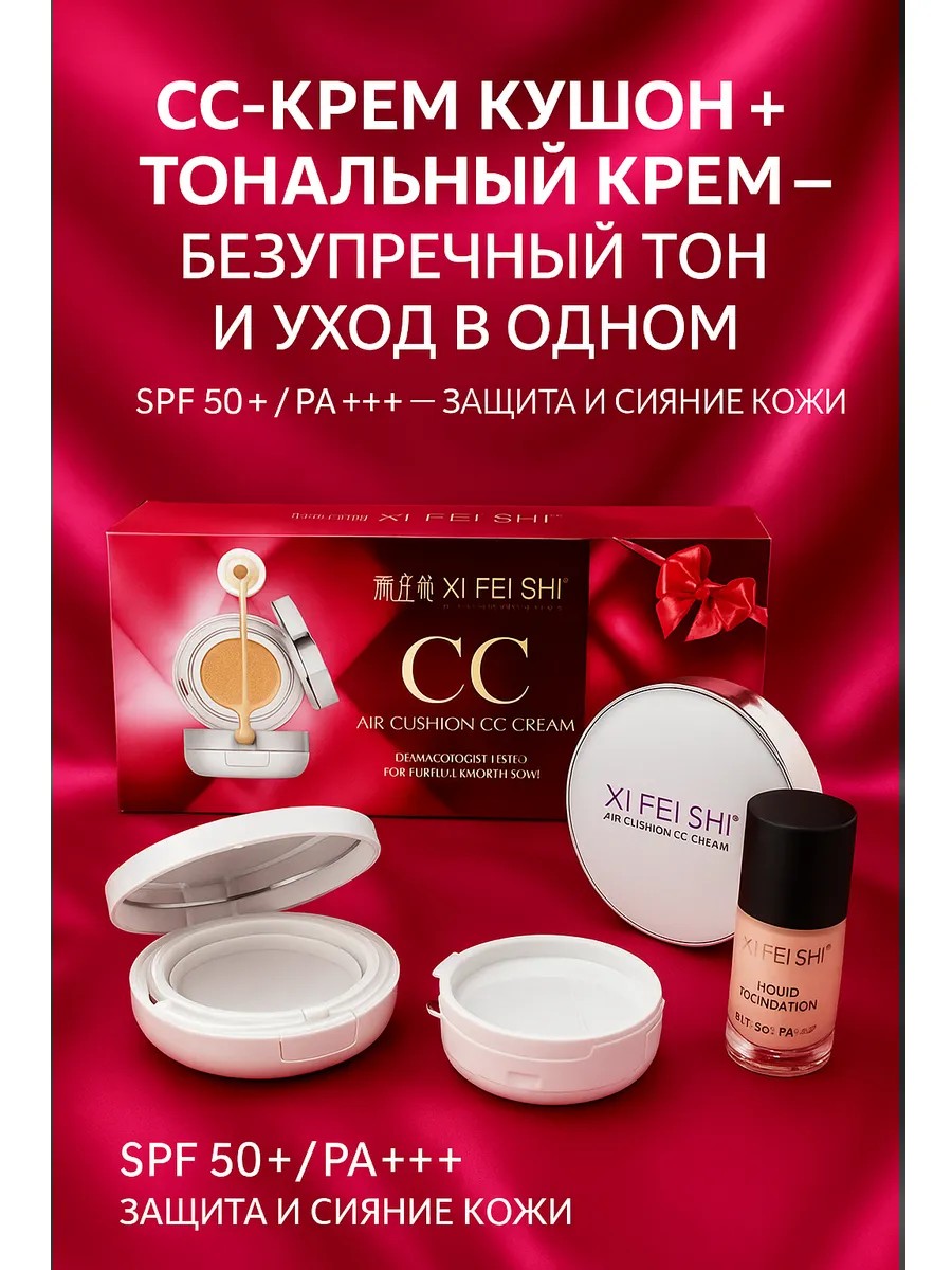 СС-крем кушон +Тональный крем SPF 50+/PA+++ — это современный набор для идеального макияжа и надежной защиты кожи. Лёгкая текстура кушона обеспечивает ровный тон лица до 12 часов, скрывает несовершенства и придаёт коже естественное сияние. Благодаря высокой степени защиты от солнца (SPF 50+/PA+++) средство предотвращает фотостарение, защищает от ультрафиолета и подходит для ежедневного использования в любое время года.