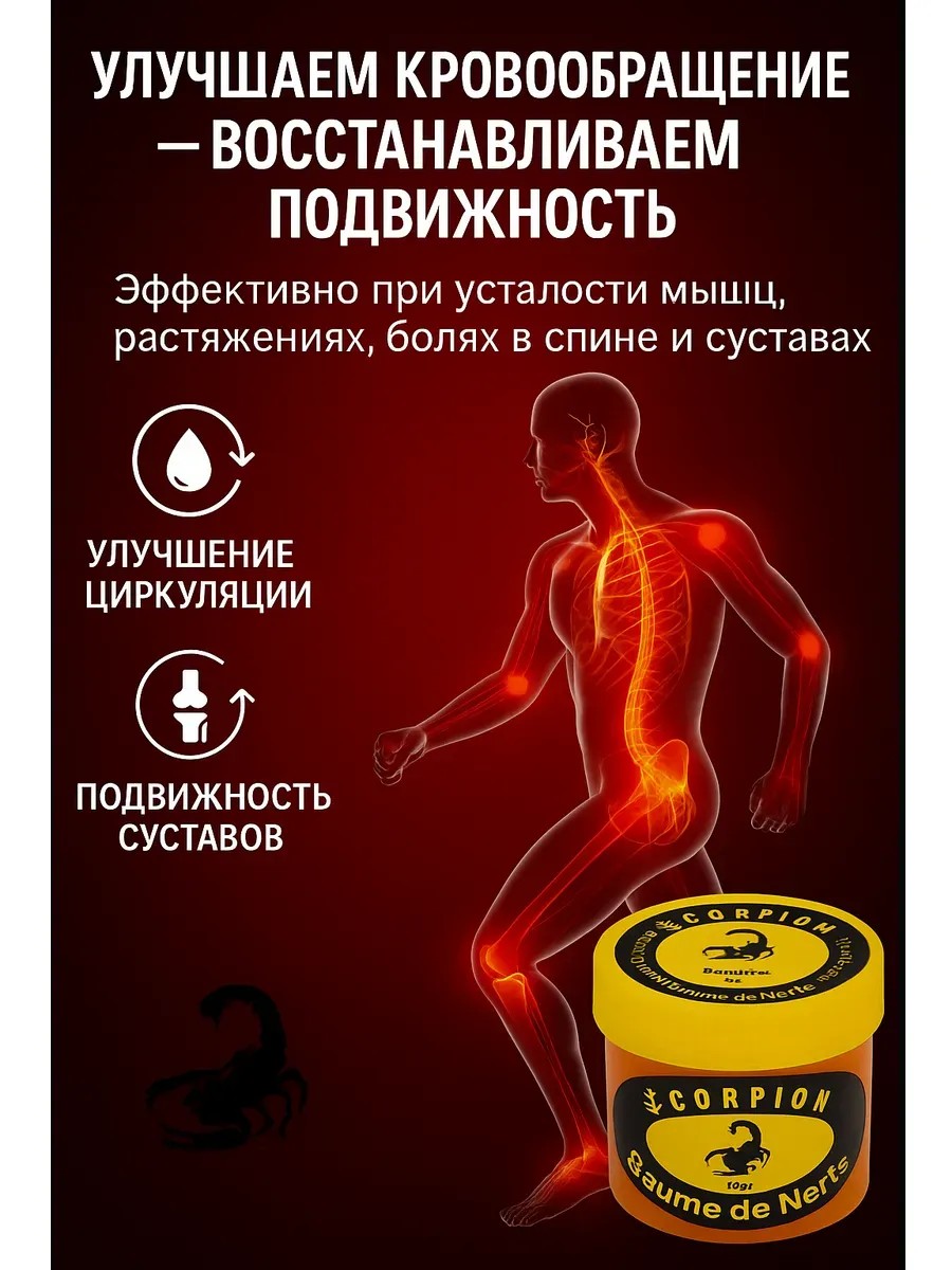 Due to its warming effect, the balm helps improve blood circulation, relax muscles and restore joint mobility.