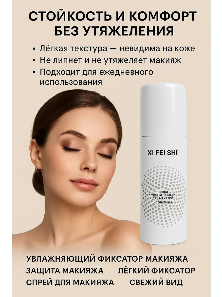 Лёгкий увлажняющий фиксатор для макияжа — это современное косметическое средство, созданное для того, чтобы ваш макияж оставался свежим, ровным и безупречным на протяжении всего дня.