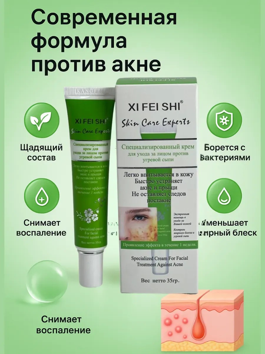 Крем для лица против акне и прыщей, 35 г — эффективное средство для ухода за проблемной кожей. Специализированная формула помогает быстро устранять высыпания, покраснения и воспаления, препятствует образованию новых прыщей и черных точек. Средство мягко воздействует на кожу, не пересушивает и не вызывает ощущения стянутости.