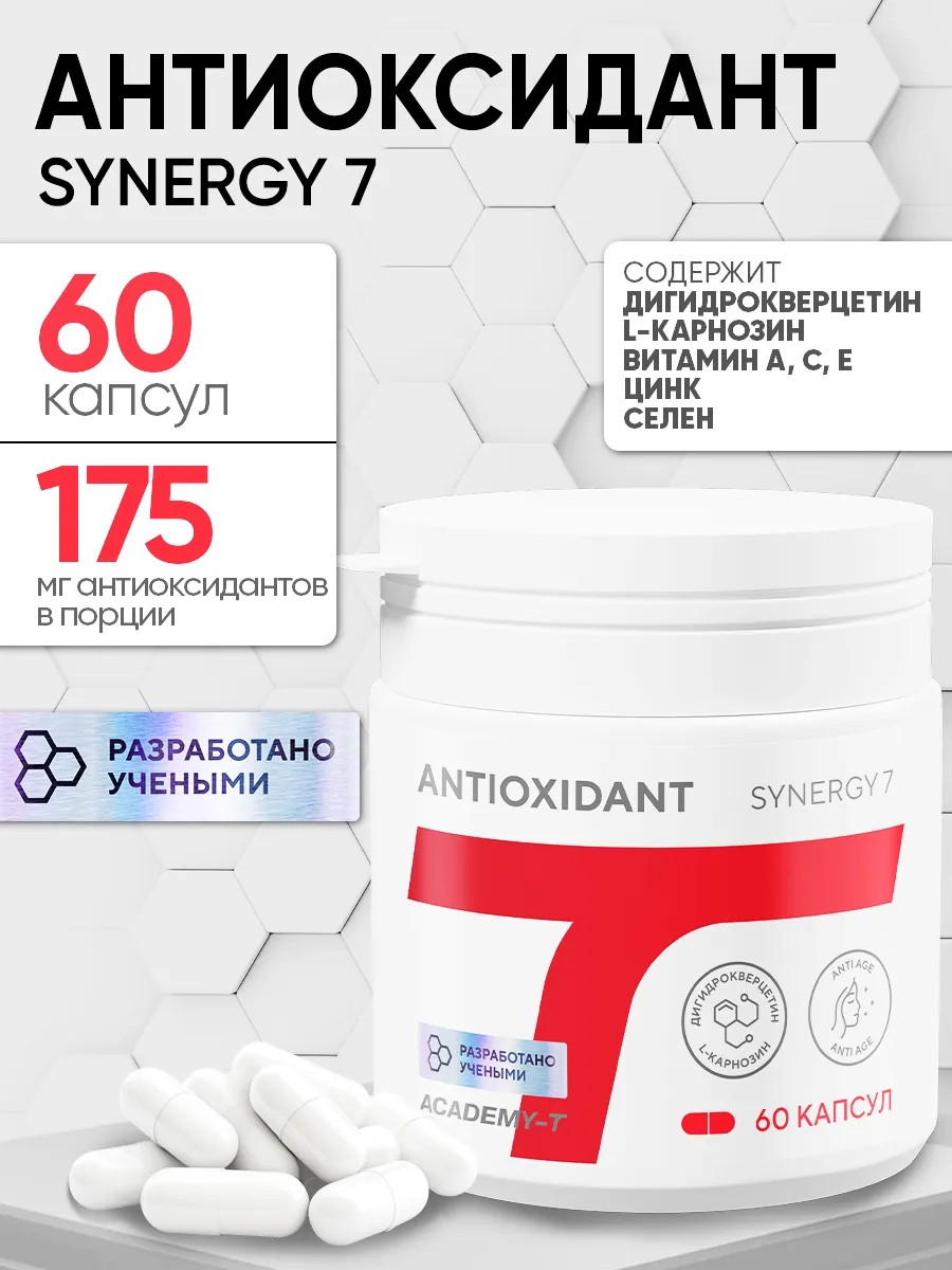ANTIOXIDANT Synergy 7 от научно-производственной компании «Академия-Т» — это профессиональный комплекс антиоксидантов, разработанный для нейтрализации свободных радикалов, замедления процессов старения, повышения иммунитета и адаптации к физическим и эмоциональным перегрузкам. Продукт сочетает природные антиоксиданты (дигидрокверцетин, L-карнозин) и ключевые нутриенты (витамины A, C, E, цинк, селен), действующие в синергии и усиливающие эффективность друг друга.