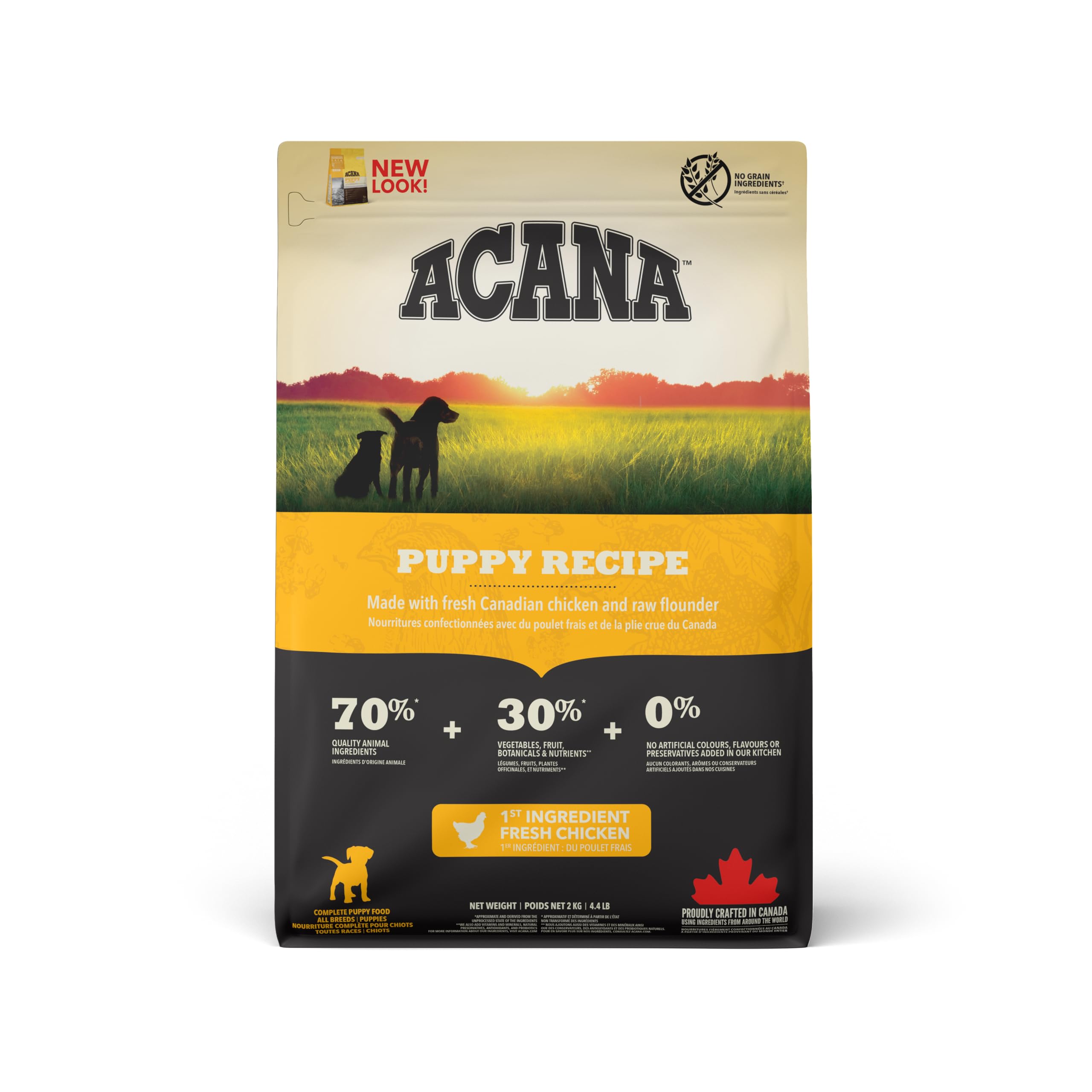 ACANA HERITAGE DOG PUPPY JUNIOR Grain-free kibble for small and medium breed puppies - Complete food Healthy food is the basis of a long life. So that your animal can benefit from it, offer it from a young age a natural and balanced diet adapted to its condition. Acana Puppy Junior grain-free kibble perfectly meets the nutritional needs of your puppy and particularly those whose adult weight reaches between 9 and 25 kg. Thanks to its premium quality ingredients, these kibbles are both nourishing, hygienic and above all rich in taste. Providing great palatability, Acana Puppy Junior will delight your pet. FEATURES OF ACANA HERITAGE GRAIN-FREE DOG PUPPY JUNIOR CROQUETTES The Acana Puppy Junior grain-free kibble recipe is composed of 100 natural foods certified for human consumption and guaranteed without chemical preservatives. The puppy formula was prepared using free-range Cobb chicken meats, wild fish caught using sustainable methods and whole eggs harvested from agricultural farms. In other words, it contains the adequate dose of animal proteins that your companion needs to grow well while becoming strong and vigorous. Puppy Junior kibbles are also rich in natural vitamins. This is thanks to the fresh fruits and vegetables included in its preparation. So the recipe contains Red Delicious apples, Bartlett pears, pumpkin, carrots and parsnips. Only grain-free foods that promote both the proper functioning of your puppy's immune system and the strengthening of his metabolism. Puppy Junior kibbles also contain chicory roots. These are known to be a natural source of prebiotics, limit the spread of bad intestinal bacteria and support the balance of intestinal flora. Puppy Junior grain-free kibble also contributes to the health of your puppy's skin and coat thanks to omega 3 fatty acids (EPA and DHA) from wild New Brunswick herring. These nutrients also contribute to your pet's brain development and visual acuity. Fortifying aromatic plants and herbs have also been added to the formula to improve liver function. To properly hydrate your pet, always leave a bowl of water near its bowl of kibble. Ingredients: Fresh deboned chicken (16 ), dehydrated chicken (13 ), dehydrated turkey (13 ), pink lentils, whole peas, fresh chicken offal (liver, heart, kidneys) (6 ), chicken fat (6 ), fresh whole eggs (4 ), fresh whole flounder (4 ), dehydrated herring (3 ), herring oil (3 ), sun-dried alfalfa (2 ), lentils greens, fava beans (2 ), whole yellow peas, pea fiber, fresh chicken cartilage (2 ), kelp, fresh pumpkin, fresh acorn squash, fresh parsnips, fresh collard greens, fresh spinach, fresh mustard greens, fresh turnip greens, fresh carrots, fresh Red Delicious apples, fresh Bartlett pears, freeze-dried chicken liver, freeze-dried turkey liver, fresh whole cranberries, fresh whole blueberries (blueberries), chicory root, turmeric, milk thistle, burdock, lavender, marshmallow root, rosehip fruits. Nutritional additives: E6 (zinc): 100 mg. Zootechnical additives: Enterococcus faecium Supplements: Zinc chelate vitamin E (for preservation) Analytical Constituents: Calcium: 1.5 - Phosphorus: 1.1 - Omega 6: 2.7 - Omega 3: 1 - EPA: 0.3 - DHA: 0.3 - Glucosamine: 1400 mg kg - Chondroitin: 900 mg kg - Linoleic acid (min.): 2.5 - Carbohydrate (NFE): 23 . Vitamins: Vit. A: 13.5 kIU kg - Vit. D3: 1450 IU kg - Vit. E: 110 IU kg - Vit. B1: 5.5 mg kg - Vit. B2: 6.5 mg kg - Vit. B3: 54 mg kg - Vit. B5: 19 mg kg - Vit. B6: 2.75 mg kg - Vit. B12: 0.08 mg kg - Folic acid: 1.5 mg kg - Choline: 2200 mg kg Minerals: Sodium: 0.35 - Chloride: 0.51 - Potassium: 0.75 - Magnesium: 0.13 - Iron: 190 mg kg - Zinc: 195 mg kg - Copper: 19 mg kg - Manganese: 13 mg kg - Iodine: 2.1 mg kg - Selenium: 0.6 mg kg Amino acids: Lysine: 2.30 - Threonine: 1.30 - Methionine: 0.64 - Isoleucine: 1.34 - Leucine: 2.36 - Valine: 1.43 - Arginine: 2.38 - Phenylalanine: 1.43 - Histidine: 0.71 - Tryptophan: 0.35 - Cystine: 0.36 - Tyrosine: 0.95 - Methionine-cysteine: 1 - Phenylalanine-tyrosine: 2.38 Plant extracts: Chicory root: 500 mg kg - Juniper berries: 500 mg kg - Angelica root: 350 mg kg - Marigold flowers: 350 mg kg - Sweet fennel: 350 mg kg - Peppermint: 300 mg kg - Lavender: 150 mg kg INGREDIENTS Organic DIRECTIONS FOR USE Respect the recommended portions BOX CONTENTS Dry foods Model Number: BR50011. Guaranteed to keep your puppy healthy, happy, and strong. Rich and varied diet of fresh whole meats with small amounts of fruits and vegetables. Supports your puppy's development and conditioning. ACANA HERITAGE CHIEN PUPPY JUNIOR Croquettes sans céréales pour chiot de petite et moyenne race - Aliment complet Une nourriture saine est la base d'une longue vie. Afin que votre animal puisse en profiter, offrez-lui dès son plus jeune âge une alimentation naturelle et équilibrée adaptée à sa condition. Les croquettes sans céréales Acana Puppy Junior répondent parfaitement aux besoins nutritionnels de votre chiot et particulièrement à ceux dont le poids à l'âge adulte atteint entre 9 et 25 kg. Grâce à ses ingrédients de qualité prémium, ces croquettes sont à la fois nourrissantes, hygiéniques et surtout riches en goût. Apportant une grande appétence, Acana Puppy Junior feront le bonheur de votre animal de compagnie. CARACTÉRISTIQUES DES CROQUETTES SANS CÉRÉALES ACANA HERITAGE CHIEN PUPPY JUNIOR La recette de croquettes sans céréales Acana Puppy Junior est composée d'aliments 100 naturels certifiés pour la consommation humaine et garantie sans conservateur chimique. La formule pour chiot a été préparée à partir de viandes de poulet Cobb élevé en plein air, du poisson sauvage pêché à l'aide de méthodes durables et d'½ufs entiers récoltés dans des fermes agricoles. Autrement dit, elle contient la dose adéquate de protéines animales dont votre compagnon a besoin pour bien grandir tout en devenant fort et vigoureux. Les croquettes Puppy Junior sont aussi riches en vitamine naturelle. Cela grâce aux fruits et l