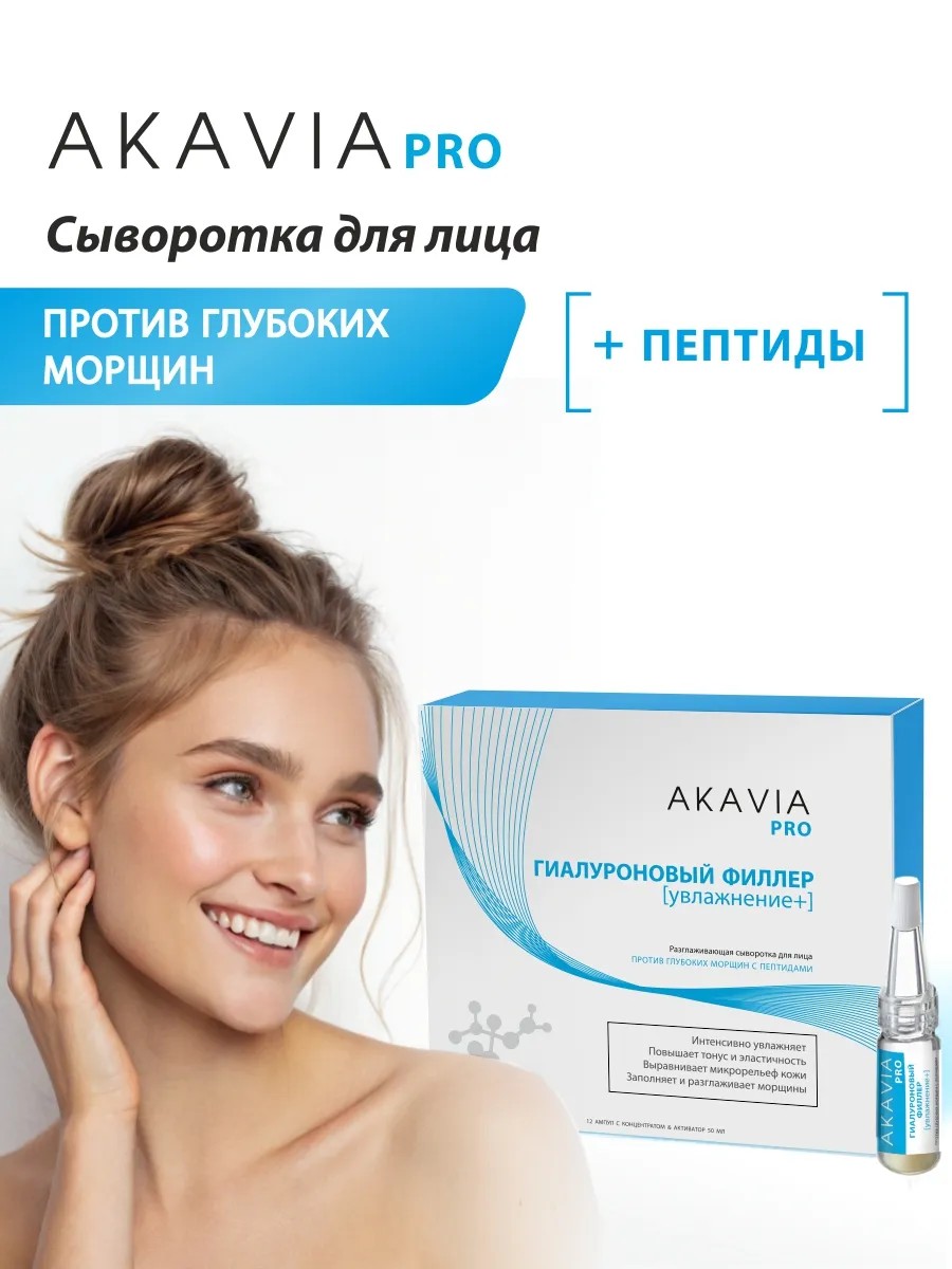 Akavia Pro anti-aging rejuvenating serum against deep wrinkles fills and smoothes wrinkles and evens out the skin's microrelief, improves tone and elasticity, intensively moisturizes, nourishes, and renews the skin of the face, neck, and décolleté.
