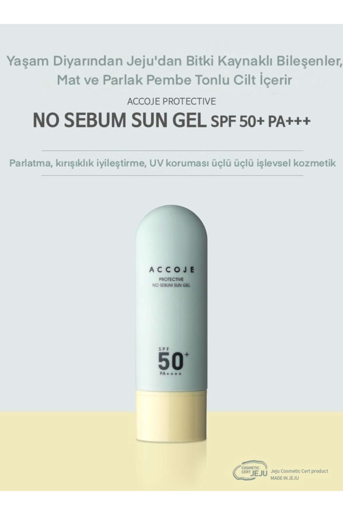 ACCOJE No Sebum Sun Gel SPF 50 PA is a lightweight sun gel that provides high sun protection and sebum control, formulated with natural ingredients from Jeju Island, Korea. This innovative sunscreen effectively protects the skin against UVA and UVB rays, while offering a matte finish that does not leave an oily feeling. Thanks to its special formula, it balances excess oil on the skin, making it ideal for oily and combination skin types. This sun gel, which leaves a feeling of freshness on the skin throughout the day and is light enough to be used under make-up, refreshes the skin with its water-based structure and provides protection without clogging the pores.